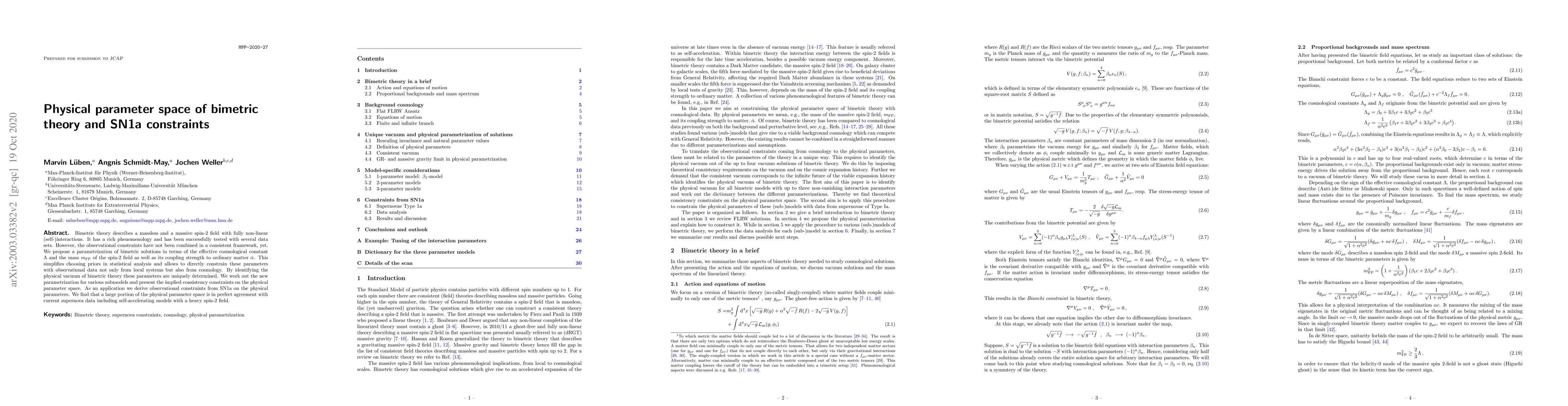 Bimetric theory describes a massless and a massive spin-2 field with fully non-linear (self-)interactions. It has a rich phenomenology and has been successfully tested with several data sets. However, the observational constraints have not been combined in a consistent framework, yet. We propose a parametrization of bimetric solutions in terms of the effective cosmological constant $\Lambda$ and the mass $m_\mathrm{FP}$ of the spin-2 field as well as its coupling strength to ordinary matter $\bar\alpha$. This simplifies choosing priors in statistical analysis and allows to directly constrain these parameters with observational data not only from local systems but also from cosmology. By identifying the physical vacuum of bimetric theory these parameters are uniquely determined. We work out the dictionary for the new parametrization for various submodels and present the implied consistency constraints on the physical parameter space. We then apply the dictionary to derive observational constraints from SN1a on the physical parameters. As a result we find that even self-accelerating models with a heavy spin-2 field are in perfect agreement with current supernova data.