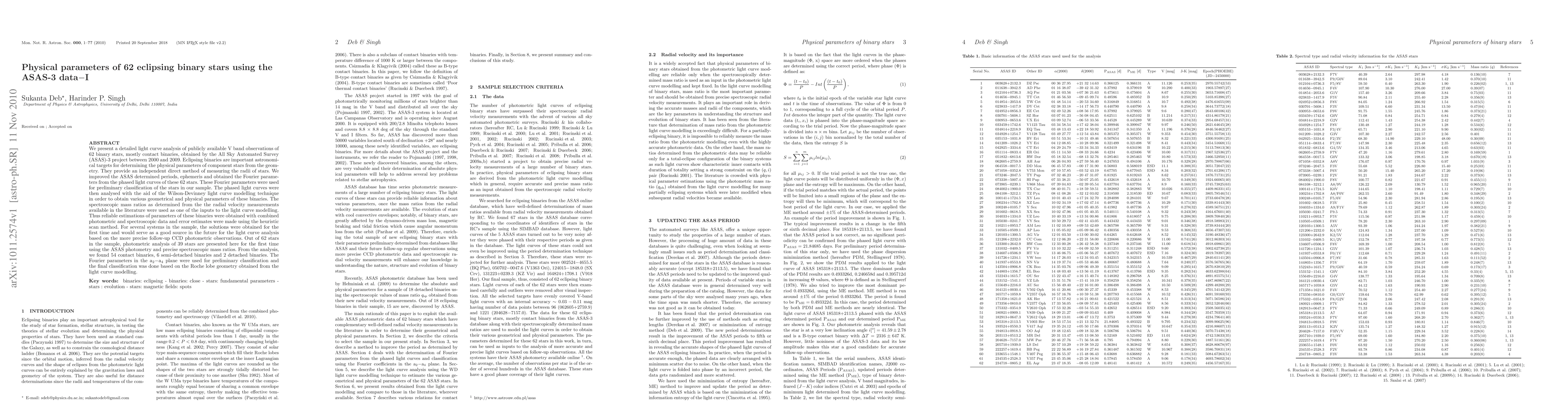 We present a detailed light curve analysis of publicly available V band observations of 62 binary stars, mostly contact binaries, obtained by the All Sky Automated Survey (ASAS)-3 project between 2000 and 2009. Eclipsing binaries are important astronomical targets for determining the physical parameters of component stars from the geometry. They provide an independent direct method of measuring the radii of stars. We improved the ASAS determined periods, ephemeris and obtained the Fourier parameters from the phased light curves of these 62 stars. These Fourier parameters were used for preliminary classification of the stars in our sample. The phased light curves were then analysed with the aid of the Wilson-Devinney light curve modelling technique in order to obtain various geometrical and physical parameters of these binaries. The spectroscopic mass ratios as determined from the the radial velocity measurements available in the literature were used as one of the inputs to the light curve modelling. Thus reliable estimations of parameters of these binaries were obtained with combined photometric and spectroscopic data and error estimates were made using the heuristic scan method.