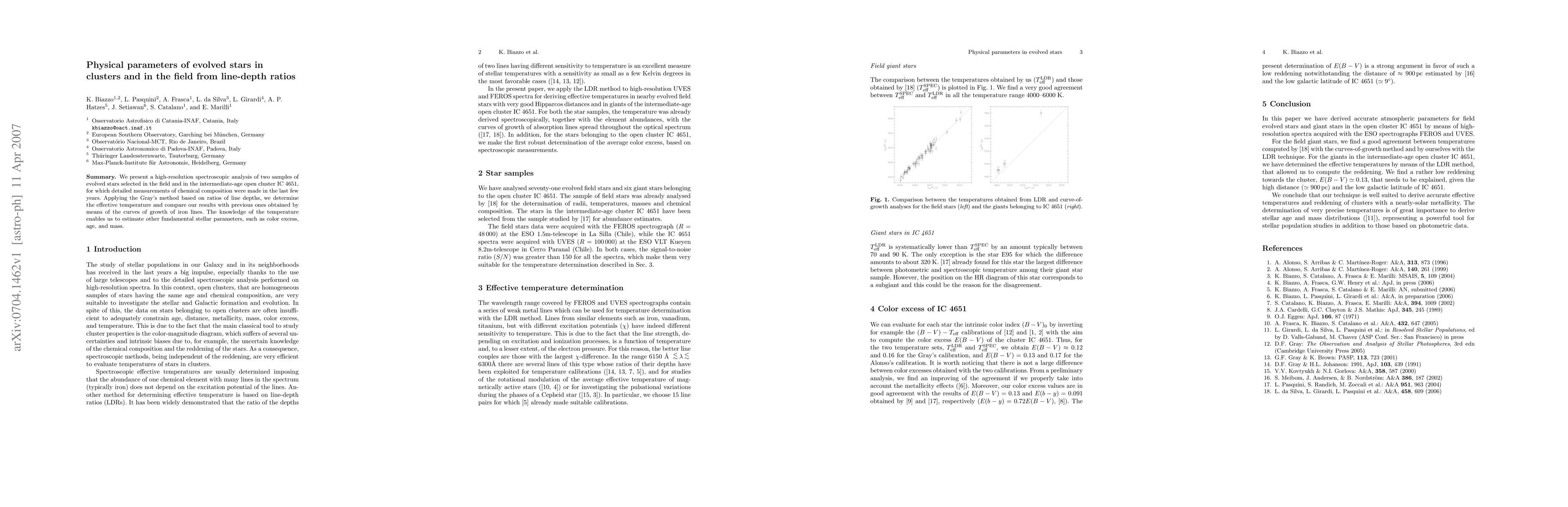 We present a high-resolution spectroscopic analysis of two samples of evolved stars selected in the field and in the intermediate-age open cluster IC 4651, for which detailed measurements of chemical composition were made in the last few years. Applying the Gray's method based on ratios of line depths, we determine the effective temperature and compare our results with previous ones obtained by means of the curves of growth of iron lines. The knowledge of the temperature enables us to estimate other fundamental stellar parameters, such as color excess, age, and mass.