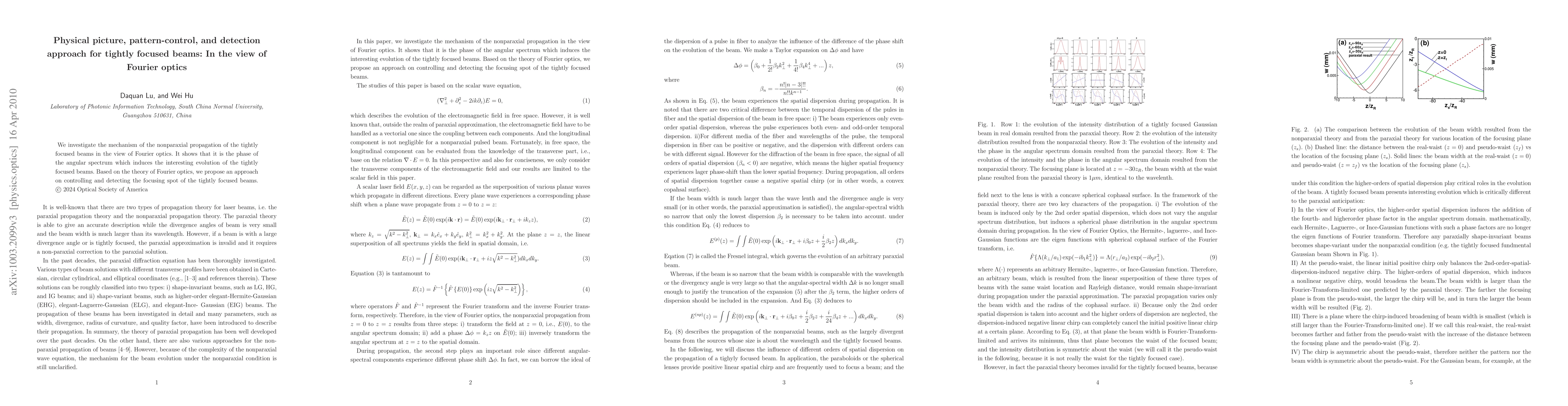 This paper explores the nonparaxial propagation of tightly focused beams through Fourier optics, highlighting the role of the angular spectrum's phase in their evolution. It proposes a method for controlling and detecting the focusing spot using Fourier optics principles.