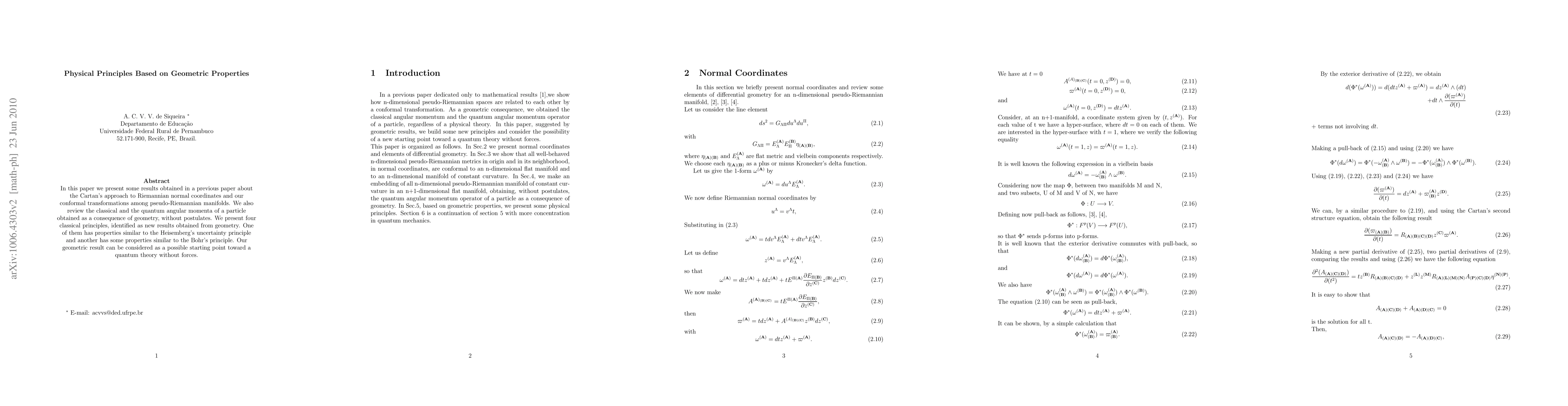In this paper we present some results obtained in a previous paper about the Cartan's approach to Riemannian normal coordinates and our conformal transformations among pseudo-Riemannian manifolds. We also review the classical and the quantum angular momenta of a particle obtained as a consequence of geometry, without postulates. We present four classical principles, identifed as new results obtained from geometry. One of them has properties similar Heisemberg's uncertaintly principle and another has some properties similar to Bohr's principle. Our geometric result can be considered as a possible starting point toward a quantum theory without forces.