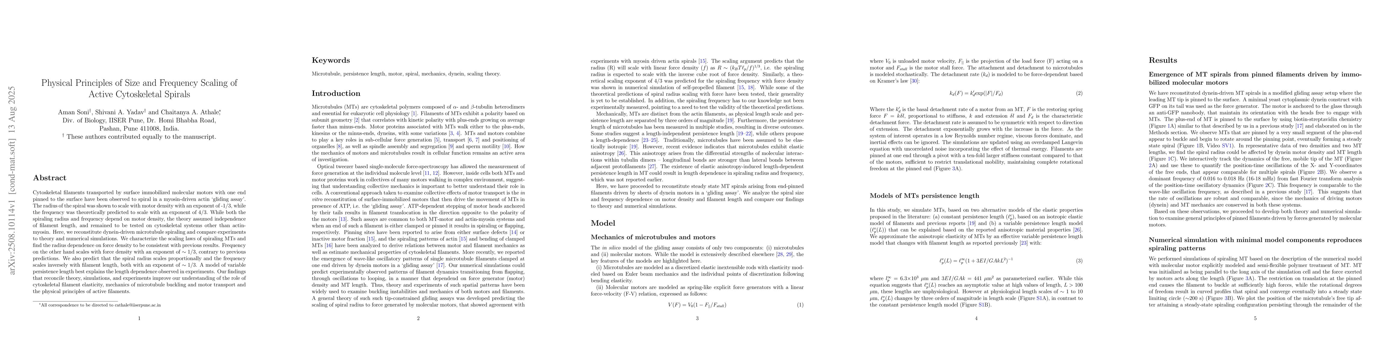 Cytoskeletal filaments transported by surface immobilized molecular motors with one end pinned to the surface have been observed to spiral in a myosin-driven actin 'gliding assay'. The radius of the spiral was shown to scale with motor density with an exponent of -1/3, while the frequency was theoretically predicted to scale with an exponent of 4/3. While both the spiraling radius and frequency depend on motor density, the theory assumed independence of filament length, and remained to be tested on cytoskeletal systems other than actin-myosin. Here, we reconstitute dynein-driven microtubule spiraling and compare experiments to theory and numerical simulations. We characterize the scaling laws of spiraling MTs and find the radius dependence on force density to be consistent with previous results. Frequency on the other hand scales with force density with an exponent of ~1/3, contrary to previous predictions. We also predict that the spiral radius scales proportionally and the frequency scales inversely with filament length, both with an exponent of ~1/3. A model of variable persistence length best explains the length dependence observed in experiments. Our findings that reconcile theory, simulations, and experiments improve our understanding of the role of cytoskeletal filament elasticity, mechanics of microtubule buckling and motor transport and the physical principles of active filaments.