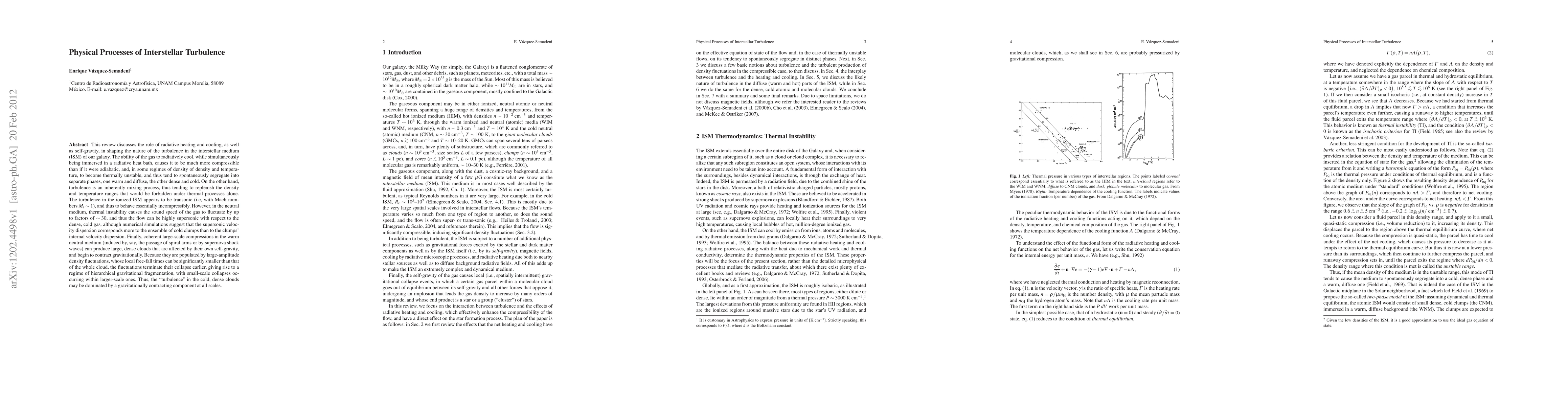 I discuss the role of self-gravity and radiative heating and cooling in shaping the nature of the turbulence in the interstellar medium (ISM) of our galaxy. The heating and cooling cause it to be highly compressible, and, in some regimes of density and temperature, to become thermally unstable, tending to spontaneously segregate into warm/diffuse and cold/dense phases. On the other hand, turbulence is an inherently mixing process, tending to replenish the density and temperature ranges that would be forbidden under thermal processes alone. The turbulence in the ionized ISM appears to be transonic (i.e, with Mach numbers $\Ms \sim 1$), and thus to behave essentially incompressibly. However, in the neutral medium, thermal instability causes the sound speed of the gas to fluctuate by up to factors of $\sim 30$, and thus the flow can be highly supersonic with respect to the dense/cold gas, although numerical simulations suggest that this behavior corresponds more to the ensemble of cold clumps than to the clumps' internal velocity dispersion. Finally, coherent large-scale compressions in the warm neutral medium (induced by, say, the passage of spiral arms or by supernova shock waves) can produce large, dense molecular clouds that are subject to their own self-gravity, and begin to contract gravitationally. Because they are populated by nonlinear density fluctuations, whose local free-fall times are significantly smaller than that of the whole cloud, the fluctuations terminate their collapse earlier, giving rise to a regime of hierarchical gravitational fragmentation, with small-scale collapses occurring within larger-scale ones. Thus, the "turbulence" in molecular clouds may be dominated by a gravitationally contracting component at all scales.