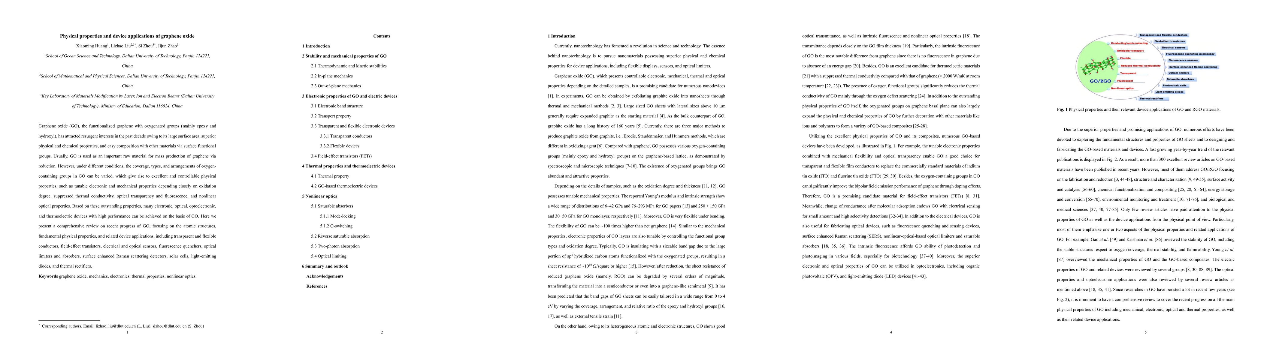 Graphene oxide (GO), the functionalized graphene with oxygenated groups (mainly epoxy and hydroxyl), has attracted resurgent interests in the past decade owing to its large surface area, superior physical and chemical properties, and easy composition with other materials via surface functional groups. Usually, GO is used as an important raw material for mass production of graphene via reduction. However, under different conditions, the coverage, types, and arrangements of oxygen-containing groups in GO can be varied, which give rise to excellent and controllable physical properties, such as tunable electronic and mechanical properties depending closely on oxidation degree, suppressed thermal conductivity, optical transparency and fluorescence, and nonlinear optical properties. Based on these outstanding properties, many electronic, optical, optoelectronic, and thermoelectric devices with high performance can be achieved on the basis of GO. Here we present a comprehensive review on recent progress of GO, focusing on the atomic structures, fundamental physical properties, and related device applications, including transparent and flexible conductors, field-effect transistors, electrical and optical sensors, fluorescence quenchers, optical limiters and absorbers, surface enhanced Raman scattering detectors, solar cells, light-emitting diodes, and thermal rectifiers.