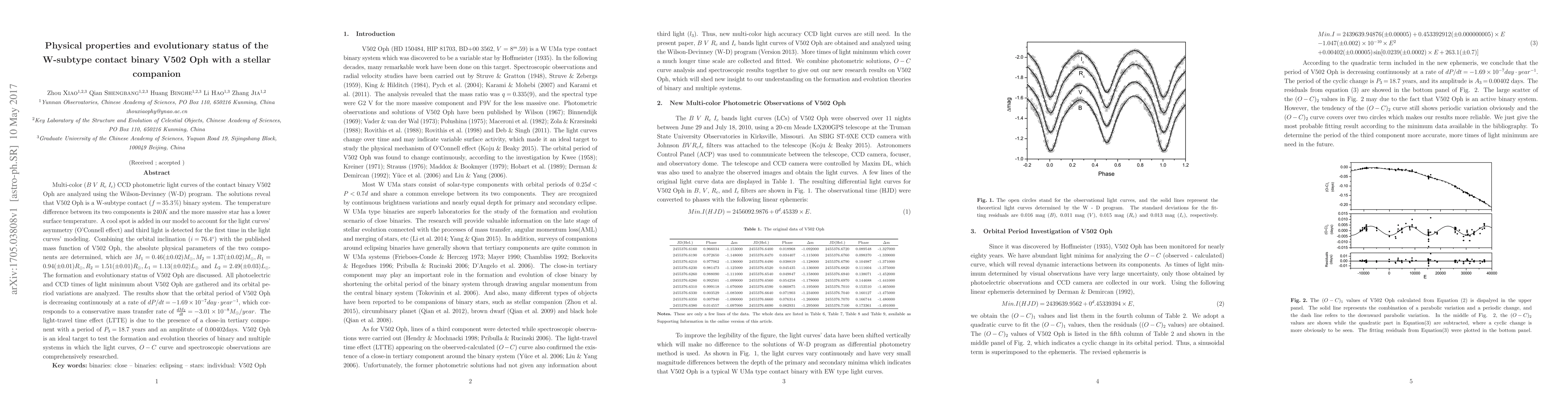 This paper analyzes the contact binary V502 Oph using multi-color CCD photometry and the Wilson-Devinney model, revealing it to be a W-subtype system with a decreasing orbital period and a conservative mass transfer rate. The study also identifies a tertiary component causing the light-travel time effect.