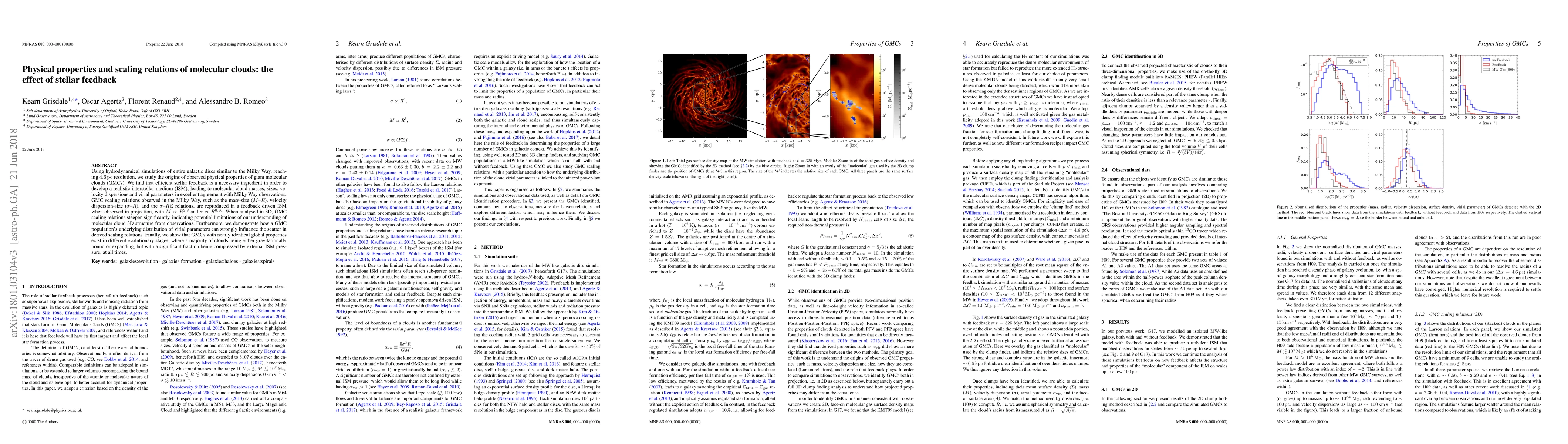 Using hydrodynamical simulations of entire galactic discs similar to the Milky Way, reaching 4.6pc resolution, we study the origins of observed physical properties of giant molecular clouds (GMCs). We find that efficient stellar feedback is a necessary ingredient in order to develop a realistic interstellar medium (ISM), leading to molecular cloud masses, sizes, velocity dispersions and virial parameters in excellent agreement with Milky Way observations. GMC scaling relations observed in the Milky Way, such as the mass-size ($M$--$R$), velocity dispersion-size ($\sigma$--$R$), and the $\sigma$--$R\Sigma$ relations, are reproduced in a feedback driven ISM when observed in projection, with $M\propto R^{2.3}$ and $\sigma\propto R^{0.56}$. When analysed in 3D, GMC scaling relations steepen significantly, indicating potential limitations of our understanding of molecular cloud 3D structure from observations. Furthermore, we demonstrate how a GMC population's underlying distribution of virial parameters can strongly influence the scatter in derived scaling relations. Finally, we show that GMCs with nearly identical global properties exist in different evolutionary stages, where a majority of clouds being either gravitationally bound or expanding, but with a significant fraction being compressed by external ISM pressure, at all times.