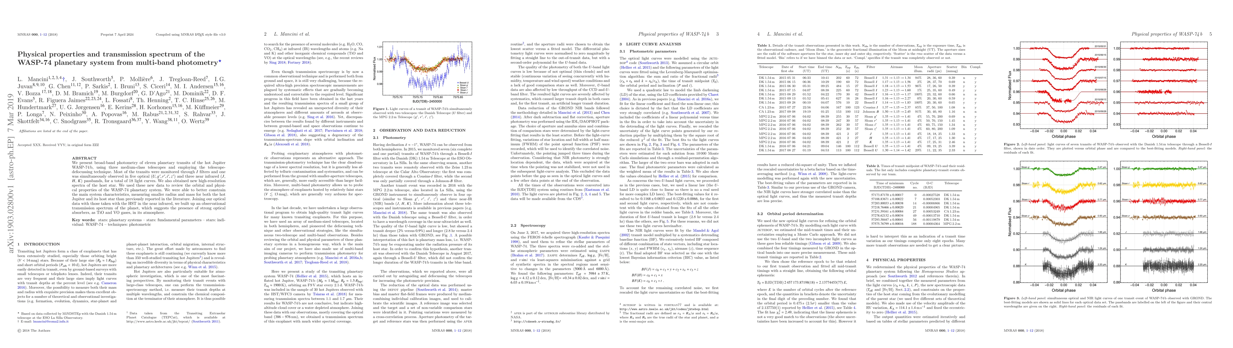This study utilizes multi-band photometry to refine the physical properties of the WASP-74 planetary system, revealing a smaller radius and mass for both the hot Jupiter WASP-74b and its host star. The transmission spectrum suggests the presence of strong optical absorbers like TiO and VO gases in the planet's atmosphere.
