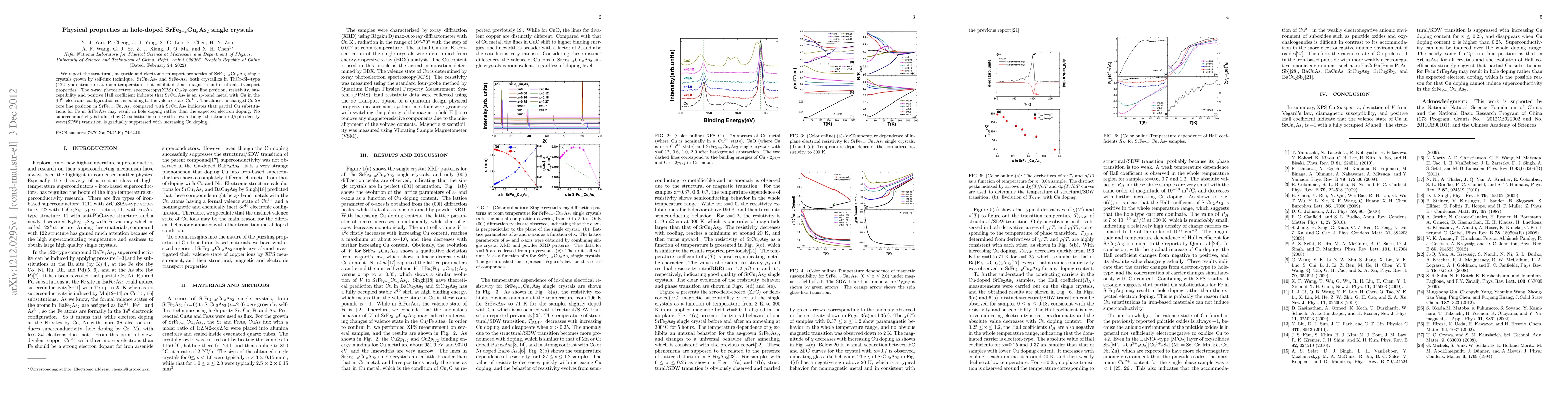This paper investigates the physical properties of hole-doped SrFe$_{2-x}$Cu$_x$As$_2$ single crystals, finding that Cu substitution leads to hole doping without inducing superconductivity, despite suppressing structural/spin density wave transitions.