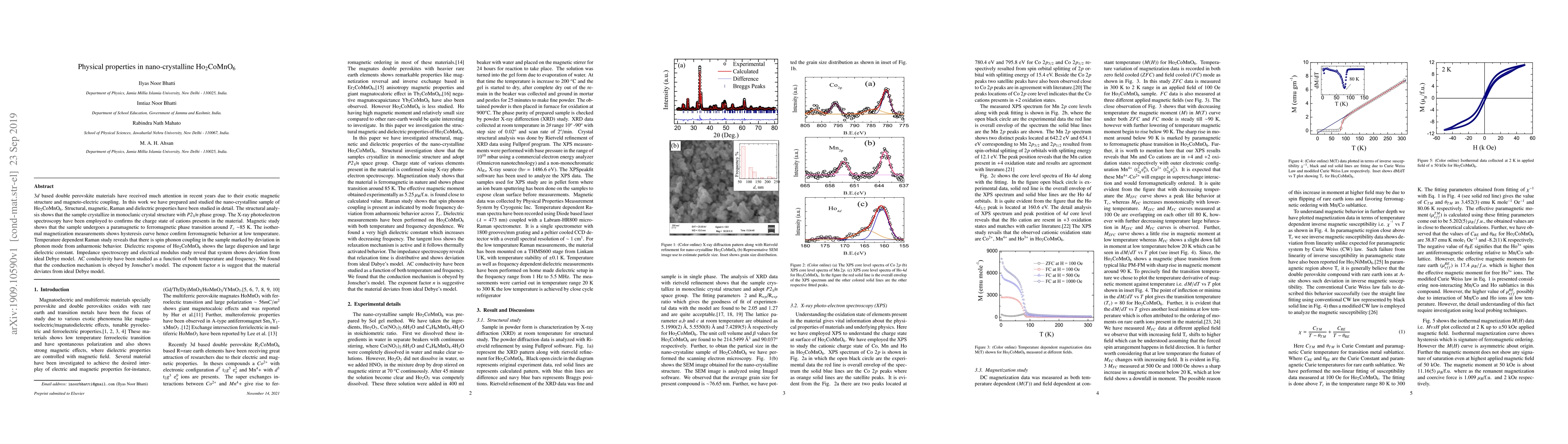 This research investigates the physical properties of nano-crystalline Ho$_2$CoMnO$_6$, revealing its monoclinic structure and a paramagnetic to ferromagnetic transition at around 85 K. The material exhibits spin-phonon coupling and significant dielectric response, with AC conductivity following Jonscher's model, indicating deviation from the ideal Debye model.