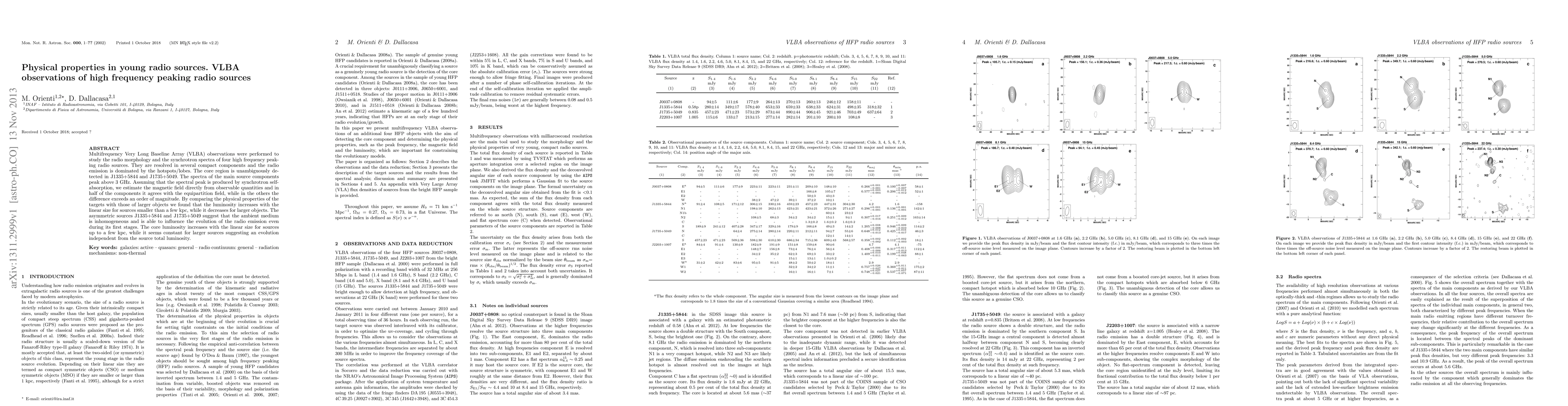 Multifrequency Very Long Baseline Array (VLBA) observations were performed to study the radio morphology and the synchrotron spectra of four high frequency peaking radio sources. They are resolved in several compact components and the radio emission is dominated by the hotspots/lobes. The core region is unambiguously detected in J1335+5844 and J1735+5049. The spectra of the main source components peak above 3 GHz. Assuming that the spectral peak is produced by synchrotron self-absorption, we estimate the magnetic field directly from observable quantities and in half of the components it agrees with the equipartition field, while in the others the difference exceeds an order of magnitude. By comparing the physical properties of the targets with those of larger objects we found that the luminosity increases with the linear size for sources smaller than a few kpc, while it decreases for larger objects. The asymmetric sources J1335+5844 and J1735+5049 suggest that the ambient medium is inhomogeneous and is able to influence the evolution of the radio emission even during its first stages. The core luminosity increases with the linear size for sources up to a few kpc, while it seems constant for larger sources suggesting an evolution independent from the source total luminosity.