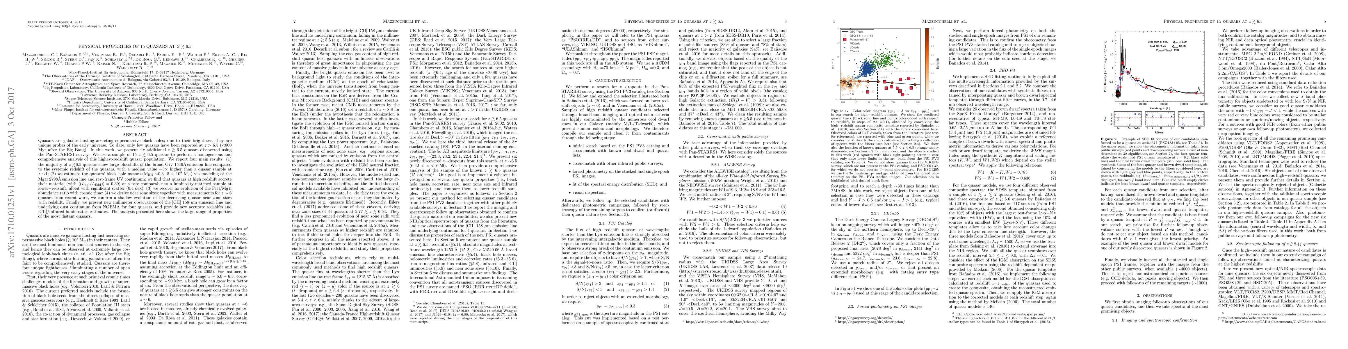 Quasars are galaxies hosting accreting supermassive black holes; due to their brightness, they are unique probes of the early universe. To date, only few quasars have been reported at $z > 6.5$ ($<$800 Myr after the Big Bang). In this work, we present six additional $z \gtrsim 6.5$ quasars discovered using the Pan-STARRS1 survey. We use a sample of 15 $z \gtrsim 6.5$ quasars to perform a homogeneous and comprehensive analysis of this highest-redshift quasar population. We report four main results: (1) the majority of $z\gtrsim$6.5 quasars show large blueshifts of the broad CIV 1549\AA$\,$emission line compared to the systemic redshift of the quasars, with a median value $\sim$3$\times$ higher than a quasar sample at $z\sim$1; (2) we estimate the quasars' black hole masses (M$\rm_{BH}\sim$0.3$-$5 $\times$ 10$^{9}$ M$_{\odot}$) via modeling of the MgII 2798\AA$\,$emission line and rest-frame UV continuum; we find that quasars at high redshift accrete their material (with $\langle (L_{\mathrm{bol}}/L_{\mathrm{Edd}}) \rangle = 0.39$) at a rate comparable to a luminosity-matched sample at lower$-$redshift, albeit with significant scatter ($0.4$ dex); (3) we recover no evolution of the FeII/MgII abundance ratio with cosmic time; (4) we derive near zone sizes; together with measurements for $z\sim6$ quasars from recent work, we confirm a shallow evolution of the decreasing quasar near zone sizes with redshift. Finally, we present new millimeter observations of the [CII] 158 $\mu$m emission line and underlying dust continuum from NOEMA for four quasars, and provide new accurate redshifts and [CII]/infrared luminosities estimates. The analysis presented here shows the large range of properties of the most distant quasars.