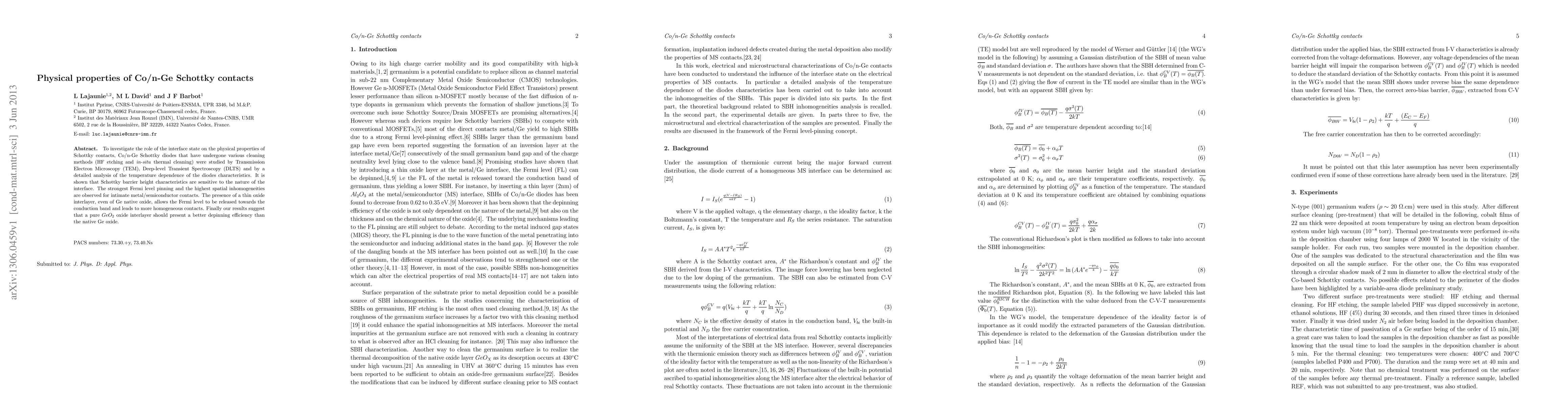 This study investigates the effect of interface states on Co/n-Ge Schottky diodes' physical properties using TEM, DLTS, and temperature-dependent analysis. Results indicate that the Schottky barrier height is influenced by the interface's nature, with the best depinning efficiency achieved with a pure GeO2 oxide interlayer compared to native Ge oxide.