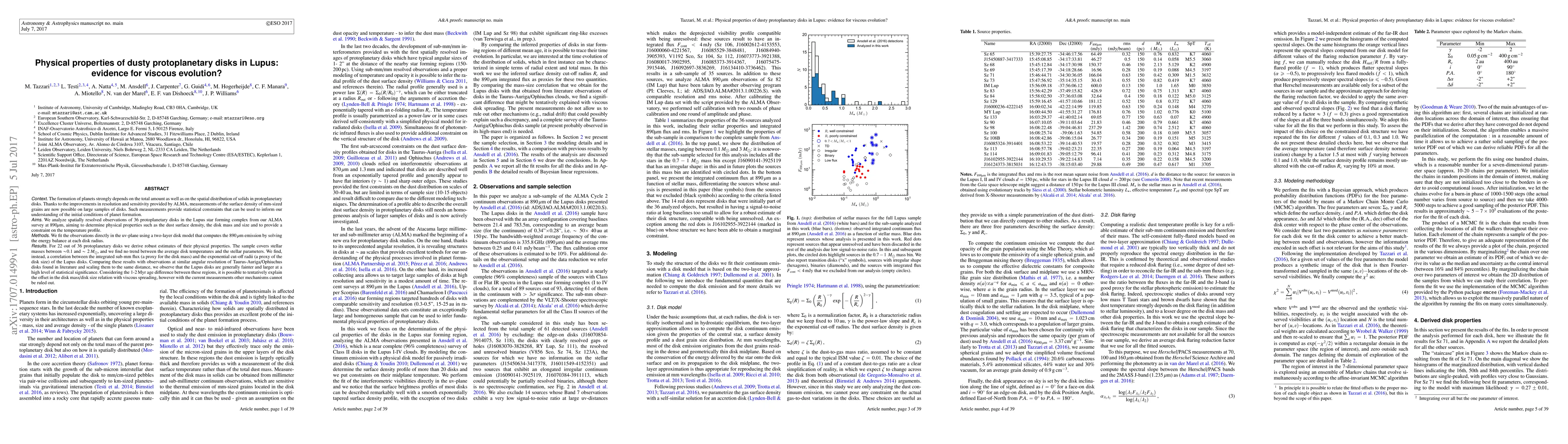 This paper analyzes ALMA observations of 36 protoplanetary disks in the Lupus star-forming region to determine their physical properties, finding a correlation between disk mass and size. The results suggest viscous evolution may explain the offset in disk mass/size relations compared to Taurus-Auriga/Ophiuchus disks, though other mechanisms cannot be ruled out.