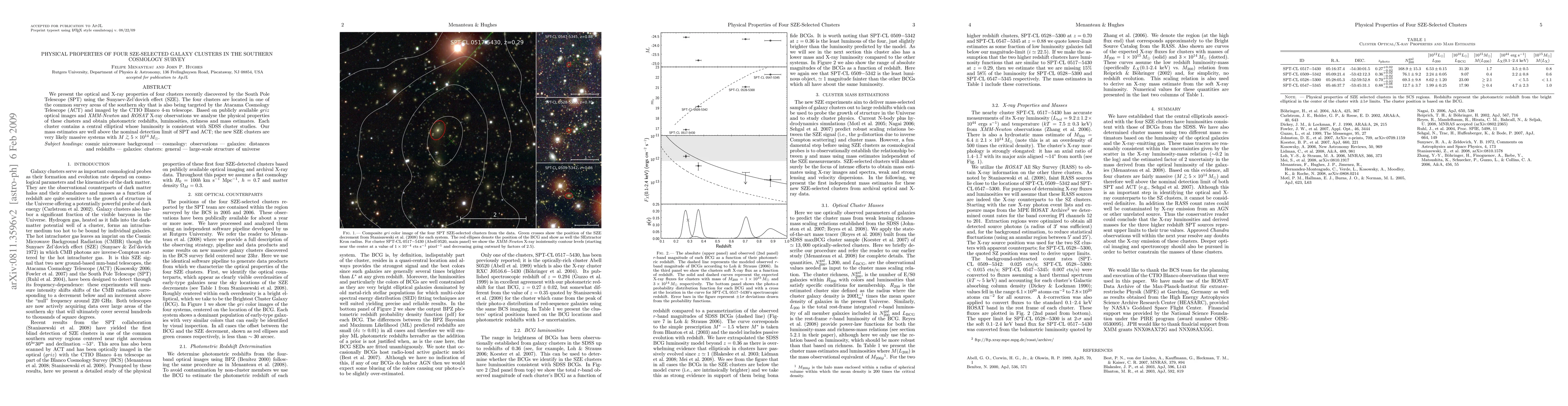 This paper investigates the optical and X-ray properties of four galaxy clusters discovered by the South Pole Telescope using the Sunyaev-Zel'dovich effect. The study provides photometric redshifts, luminosities, richness, and mass estimates, revealing that these clusters are likely massive systems with masses exceeding 5x10^14 M_sun.