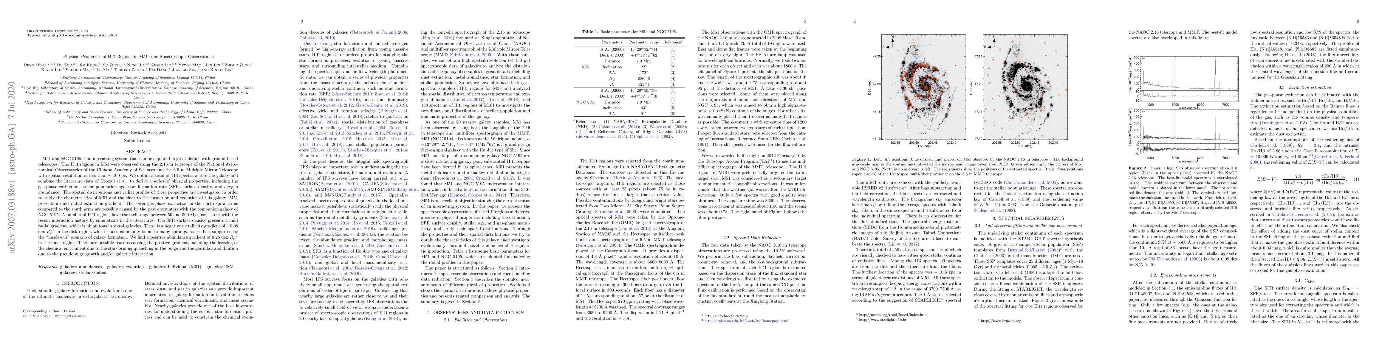 M51 and NGC 5195 is an interacting system that can be explored in great details with ground-based telescopes. The H II regions in M51 were observed using the 2.16 m telescope of the National Astronomical Observatories of the Chinese Academy of Sciences and the 6.5 m Multiple Mirror Telescope with spatial resolution of less than $\sim100$ pc. We obtain a total of 113 spectra across the galaxy and combine the literature data of Croxall et al. to derive a series of physical properties, including the gas-phase extinction, stellar population age, star formation rate (SFR) surface density, and oxygen abundance. The spatial distributions and radial profiles of these properties are investigated in order to study the characteristics of M51 and the clues to the formation and evolution of this galaxy. M51 presents a mild radial extinction gradient. The lower gas-phase extinction in the north spiral arms compared to the south arms are possibly caused by the past encounters with the companion galaxy of NGC 5195. A number of H II regions have the stellar age between 50 and 500 Myr, consistent with the recent interaction history by simulations in the literatures. The SFR surface density presents a mild radial gradient, which is ubiquitous in spiral galaxies. There is a negative metallicity gradient of $-0.08$ dex $R_{e}^{-1}$ in the disk region, which is also commonly found in many spiral galaxies. It is supported by the "inside-out" scenario of galaxy formation. We find a positive abundance gradient of 0.26 dex $R_{e}^{-1}$ in the inner region. There are possible reasons causing the positive gradient, including the freezing of the chemical enrichment due to the star-forming quenching in the bulge and the gas infall and dilution due to the pseudobulge growth and/or galactic interaction.