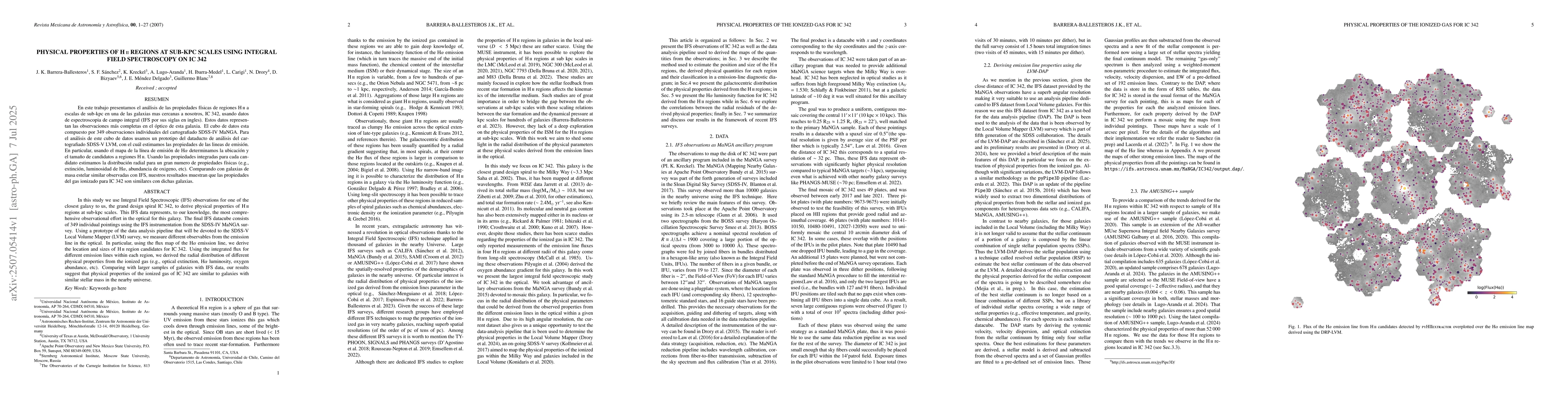 In this study we use Integral Field Spectroscopic (IFS) observations for one of the closest galaxy to us, the grand design spiral IC 342, to derive physical properties of HII regions at sub-kpc scales. This IFS data represents, to our knowledge, the most comprehensive observational effort in the optical for this galaxy. The final IFS datacube consists of 349 individual pointings using the IFS instrumentation from the SDSS-IV MaNGA survey. Using a prototype of the data analysis pipeline that will be devoted to the SDSS-V Local Volume Mapper (LVM) survey, we measure different observables from the emission line in the optical. In particular, using the flux map of the H$\alpha$ emission line, we derive the location and sizes of H ii region candidates for IC 342. Using the integrated flux for different emission lines within each region, we derived the radial distribution of different physical properties from the ionized gas (e.g., optical extinction, H$\alpha$ luminosity, oxygen abundance, etc). Comparing with larger samples of galaxies with IFS data, our results suggest that physical properties of the ionized gas of IC 342 are similar to galaxies with similar stellar mass in the nearby universe.