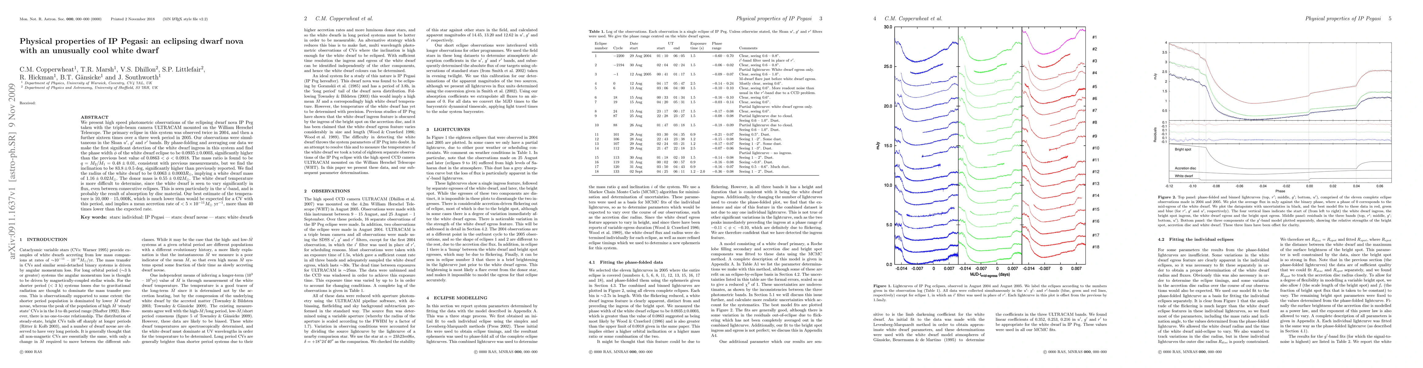 We present high speed photometric observations of the eclipsing dwarf nova IP Peg taken with the triple-beam camera ULTRACAM mounted on the William Herschel Telescope. The primary eclipse in this system was observed twice in 2004, and then a further sixteen times over a three week period in 2005. Our observations were simultaneous in the Sloan u', g' and r' bands. By phase-folding and averaging our data we make the first significant detection of the white dwarf ingress in this system and find the phase width of the white dwarf eclipse to be 0.0935 +/- 0.0003, significantly higher than the previous best value of between 0.0863 and 0.0918. The mass ratio is found to be q = M2 /M1 = 0.48 +/- 0.01, consistent with previous measurements, but we find the inclination to be 83.8 +/- 0.5 deg, significantly higher than previously reported. We find the radius of the white dwarf to be 0.0063 +/- 0.0003 solar radii, implying a white dwarf mass of 1.16 +/- 0.02 solar masses. The donor mass is 0.55 +/- 0.02 solar masses. The white dwarf temperature is more difficult to determine, since the white dwarf is seen to vary significantly in flux, even between consecutive eclipses. This is seen particularly in the u'-band, and is probably the result of absorption by disc material. Our best estimate of the temperature is 10,000 - 15,000K, which is much lower than would be expected for a CV with this period, and implies a mean accretion rate of less than 5 times 10^-11 solar masses per year, more than 40 times lower than the expected rate.