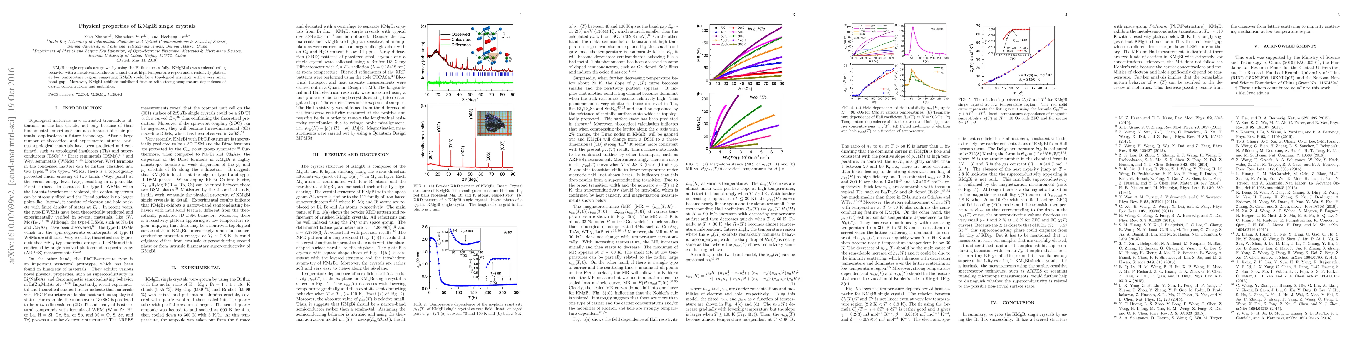 KMgBi single crystals are grown by using the Bi flux successfully. KMgBi shows semiconducting behavior with a metal-semiconductor transition at high temperature region and a resistivity plateau at low temperature region, suggesting KMgBi could be a topological insulator with a very small band gap. Moreover, KMgBi exhibits multiband feature with strong temperature dependence of carrier concentrations and mobilities.