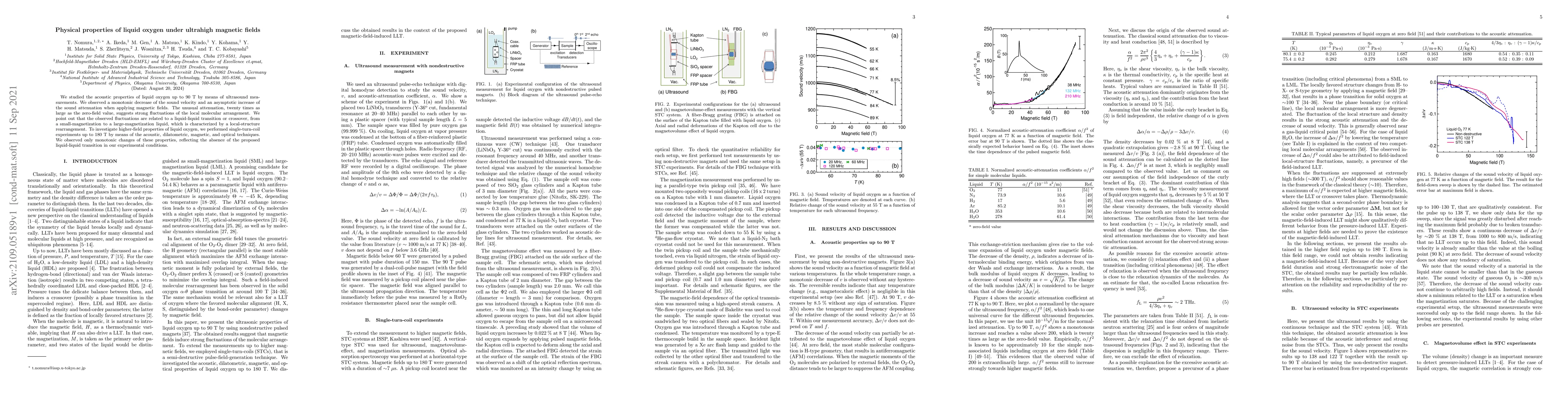 We studied the acoustic properties of liquid oxygen up to 90 T by means of ultrasound measurements. We observed a monotonic decrease of the sound velocity and an asymptotic increase of the sound attenuation when applying magnetic fields. The unusual attenuation, twenty times as large as the zero-field value, suggests strong fluctuations of the local molecular arrangement. We point out that the observed fluctuations are related to a liquid-liquid transition or crossover, from a small-magnetization to a large-magnetization liquid, which is characterized by a local-structure rearrangement. To investigate higher-field properties of liquid oxygen, we performed single-turn-coil experiments up to 180 T by means of the acoustic, dilatometric, magnetic, and optical techniques. We observed only monotonic changes of these properties, reflecting the absence of the proposed liquid-liquid transition in our experimental conditions.