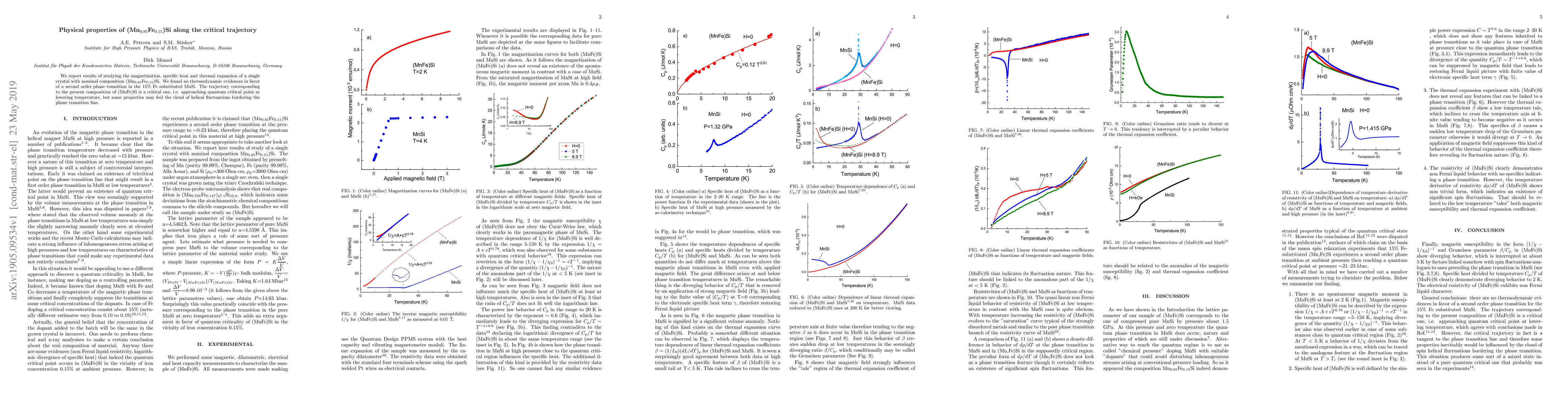 We report results of studying the magnetization, specific heat and thermal expansion of a single crystal with nominal composition Mn 0.85 Fe 0.15 Si . We found no thermodynamic evidences in favor a second order phase transition in the 15 % Fe substituted MnSi. The trajectory corresponding to the present composition of (MnFe)Si is a critical one, i.e. approaching quantum critical point at lowering temperature, but some properties may feel the cloud of helical fluctuations bordering the phase transition line.