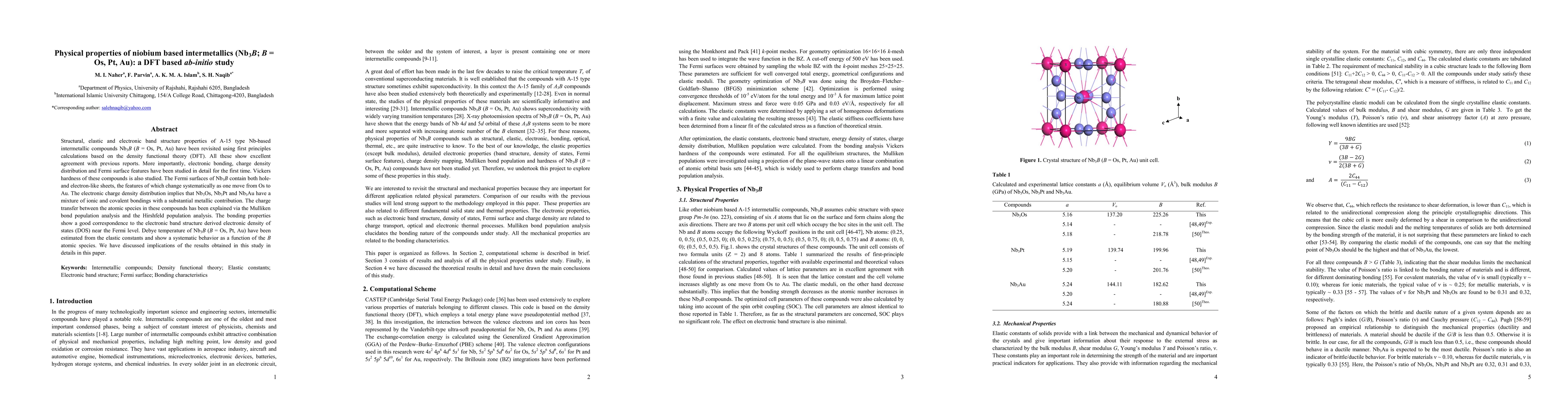 This study uses density functional theory to investigate the structural, elastic, and electronic properties of Nb3B (B = Os, Pt, Au) intermetallics, revealing detailed bonding and Fermi surface characteristics. The compounds exhibit a mixture of ionic and covalent bonding with significant metallic contributions, and their Vickers hardness and Debye temperature show systematic variations with the B element.