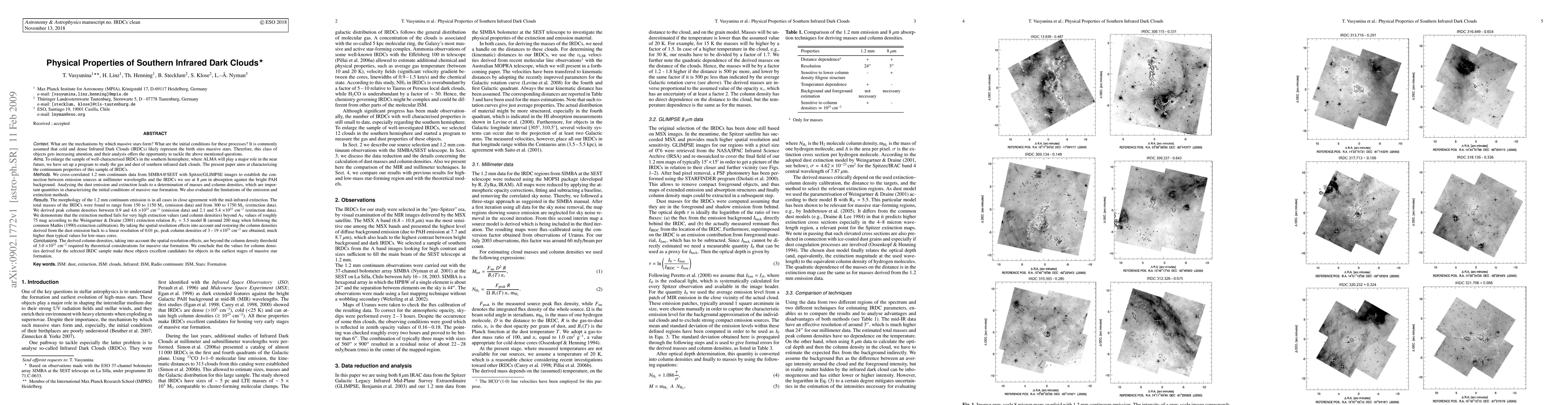 This paper characterizes the physical properties of southern Infrared Dark Clouds (IRDCs), finding masses ranging from 150 to 1750 $\rm M_\odot$ and peak column densities up to 5.4 $\times 10^{22}$ cm$^{-2}$. These high column densities suggest IRDCs are prime candidates for early massive star formation.