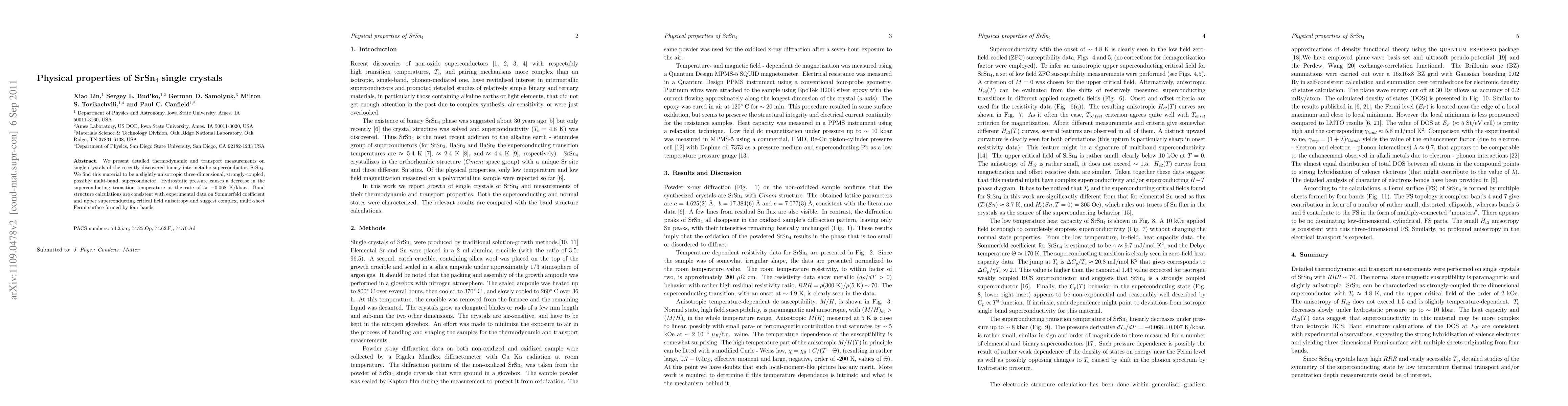 We present detailed thermodynamic and transport measurements on single crystals of the recently discovered binary intermetallic superconductor, SrSn4. We find this material to be a slightly anisotropic three-dimensional, strongly-coupled, possibly multi-band, superconductor. Hydrostatic pressure causes a decrease in the superconducting transition temperature at the rate of -0.068 K/kbar. Band structure calculations are consistent with experimental data on Sommerfeld coefficient and upper superconducting critical field anisotropy and suggest complex, multi-sheet Fermi surface formed by four bands.
