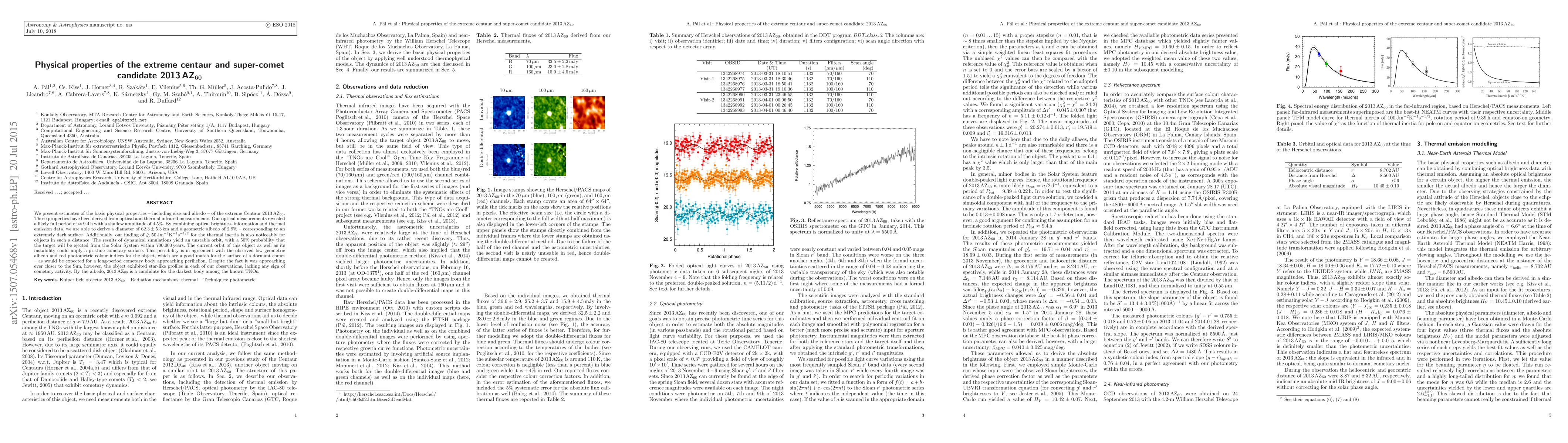 We present estimates of the basic physical properties -- including size and albedo -- of the extreme Centaur 2013 AZ60. These properties have been derived from optical and thermal infrared measurements. Our optical measurements revealed a likely full period of ~9.4 h with a shallow amplitude of 4.5%. By combining optical brightness information and thermal emission data, we are able to derive a diameter of 62.3 +/- 5.3 km and a geometric albedo of 2.9% -- corresponding to an extremely dark surface. Additionally, our finding of ~> 50 Jm^{-2}K^{-1}s^{-1/2} for the thermal inertia is also noticeably for objects in such a distance. The results of dynamical simulations yield an unstable orbit, with a 50% probability that the target will be ejected from the Solar System within 700,000 years. The current orbit of this object as well as its instability could imply a pristine cometary surface. This possibility is in agreement with the observed low geometric albedo and red photometric colour indices for the object, which are a good match for the surface of a dormant comet -- as would be expected for a long-period cometary body approaching perihelion. Despite the fact it was approaching ever closer to the Sun, however, the object exhibited star-like profiles in each of our observations, lacking any sign of cometary activity. By the albedo, 2013 AZ60 is a candidate for the darkest body among the known TNOs.