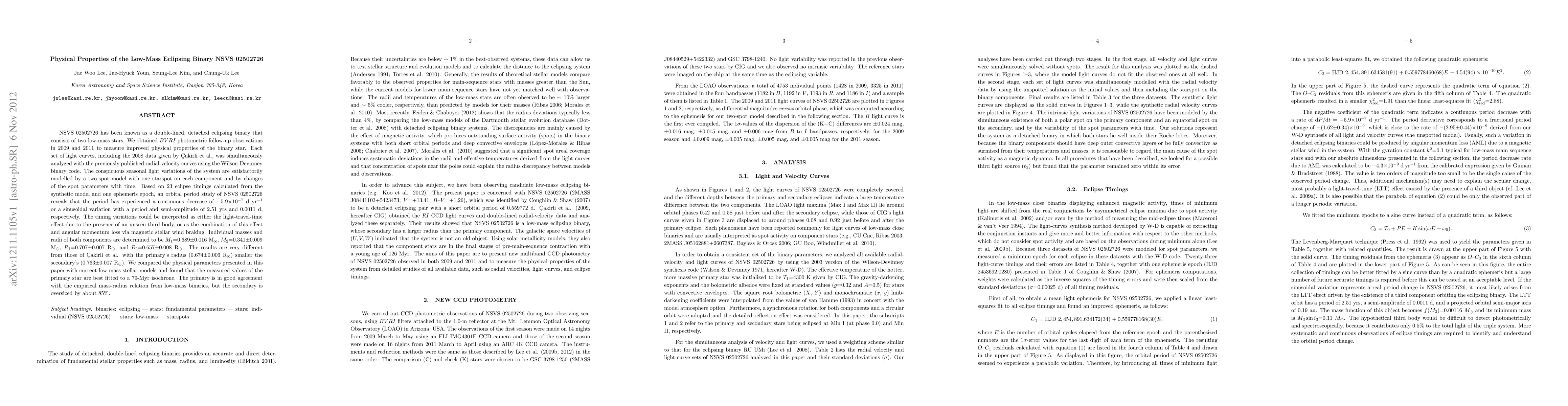 NSVS 02502726 has been known as a double-lined, detached eclipsing binary that consists of two low-mass stars. We obtained $BVRI$ photometric follow-up observations in 2009 and 2011 to measure improved physical properties of the binary star. Each set of light curves, including the 2008 data given by \cCakirli et al., was simultaneously analyzed with the previously published radial-velocity curves using the Wilson-Devinney binary code. The conspicuous seasonal light variations of the system are satisfactorily modelled by a two-spot model with one starspot on each component and by changes of the spot parameters with time. Based on 23 eclipse timings calculated from the synthetic model and one ephemeris epoch, an orbital period study of NSVS 02502726 reveals that the period has experienced a continuous decrease of $-5.9\times10^{-7}$ d yr$^{-1}$ or a sinusoidal variation with a period and semi-amplitude of 2.51 yrs and 0.0011 d, respectively. The timing variations could be interpreted as either the light-travel-time effect due to the presence of an unseen third body, or as the combination of this effect and angular momentum loss via magnetic stellar wind braking. Individual masses and radii of both components are determined to be $M_1$=0.689$\pm$0.016 M$_\odot$, $M_2$=0.341$\pm$0.009 M$_\odot$, $R_1$=0.707$\pm$0.007 R$_\odot$, and $R_2$=0.657$\pm$0.008 R$_\odot$. The results are very different from those of \cCakirli et al. with the primary's radius (0.674$\pm$0.006 R$_\odot$) smaller the secondary's (0.763$\pm$0.007 R$_\odot$). We compared the physical parameters presented in this paper with current low-mass stellar models and found that the measured values of the primary star are best fitted to a 79-Myr isochrone. The primary is in good agreement with the empirical mass-radius relation from low-mass binaries, but the secondary is oversized by about 85%.