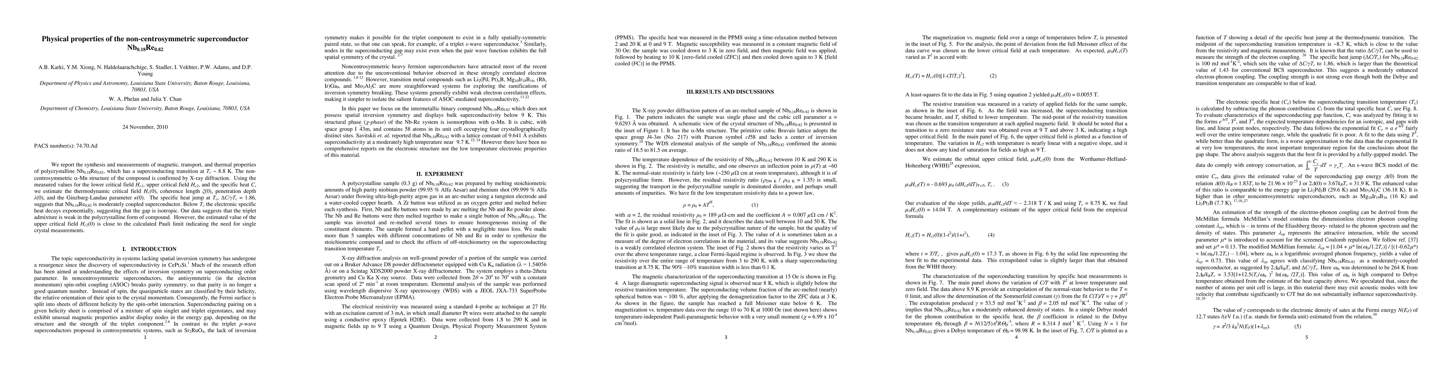 We report the synthesis and measurements of magnetic, transport, and thermal properties of polycrystalline Nb0.18Re0.82, which has a superconducting transition at Tc ~ 8.8 K. The non-centrosymmetric alpha-Mn structure of the compound is confirmed by X-ray diffraction. Using the measured values for the lower critical field Hc1, upper critical field Hc2, and the specific heat C, we estimate the thermodynamic critical field Hc(0), coherence length {\xi}(0), penetration depth {\lambda}(0), and the Ginzburg-Landau parameter {\kappa}(0). The specific heat jump at Tc, {\Delta}C/{\gamma}Tc = 1.86, suggests that Nb0.18Re0.82 is moderately coupled superconductor. Below Tc the electronic specific heat decays exponentially, suggesting that the gap is isotropic. Our data suggests that the triplet admixture is weak in the polycrystalline form of compound. However, the estimated value of the upper critical field Hc2(0) is close to the calculated Pauli limit indicating the need for single crystal measurements.