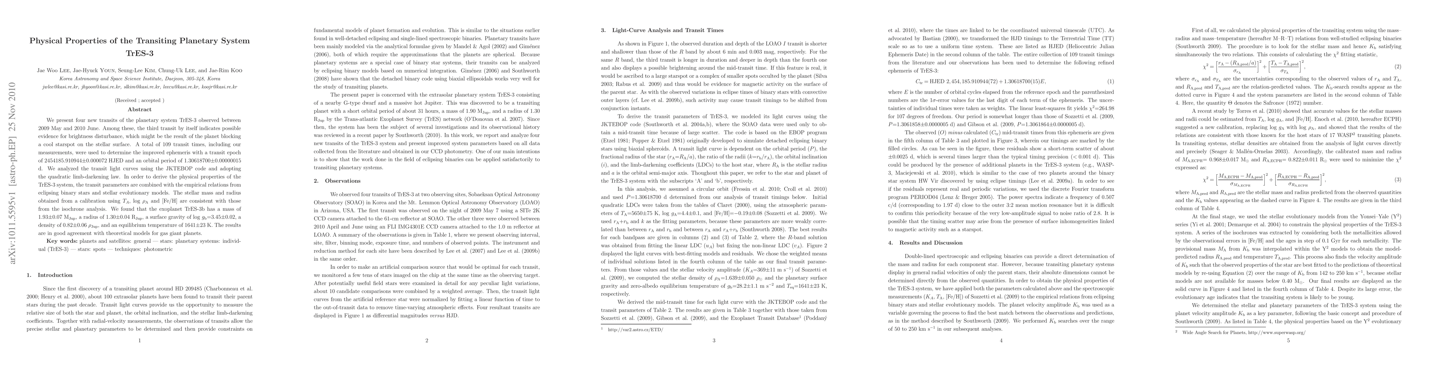This paper reports new transit observations of the TrES-3 planetary system, revealing an improved ephemeris and physical properties of the exoplanet TrES-3b, including its mass, radius, density, and equilibrium temperature, consistent with theoretical models for gas giants.