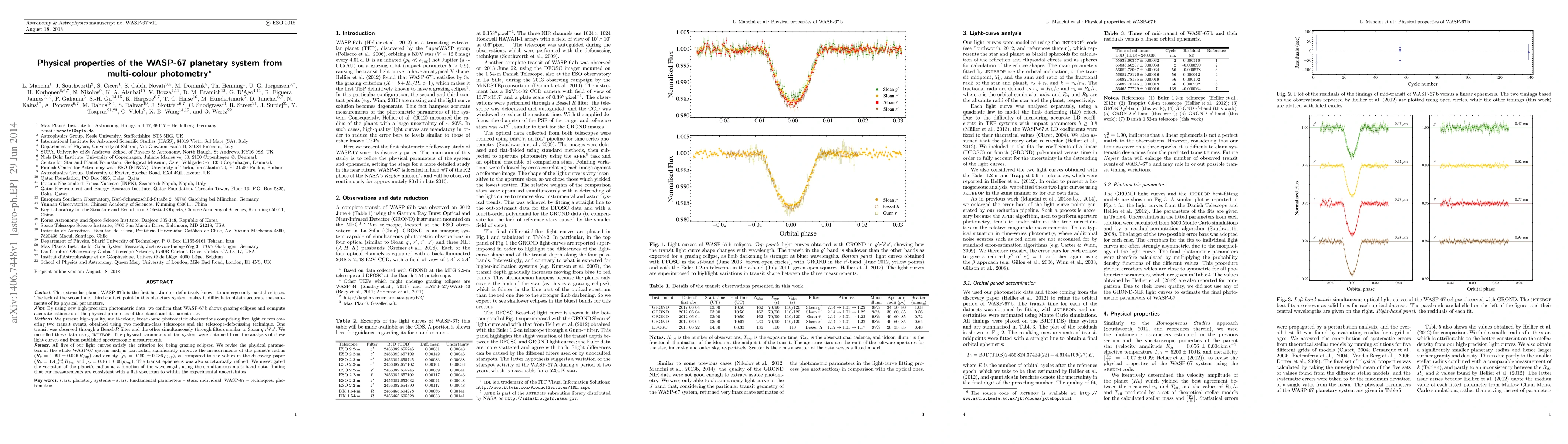 The extrasolar planet WASP-67 b is the first hot Jupiter definitively known to undergo only partial eclipses. The lack of the second and third contact point in this planetary system makes it difficult to obtain accurate measurements of its physical parameters. Aims. By using new high-precision photometric data, we confirm that WASP-67 b shows grazing eclipses and compute accurate estimates of the physical properties of the planet and its parent star. Methods. We present high-quality, multi-colour, broad-band photometric observations comprising five light curves covering two transit events, obtained using two medium-class telescopes and the telescope-defocussing technique. One transit was observed through a Bessel-R filter and the other simultaneously through filters similar to Sloan griz. We modelled these data using jktebop. The physical parameters of the system were obtained from the analysis of these light curves and from published spectroscopic measurements. Results. All five of our light curves satisfy the criterion for being grazing eclipses. We revise the physical parameters of the whole WASP-67 system and, in particular, significantly improve the measurements of the planet's radius and density as compared to the values in the discovery paper. The transit ephemeris was also substantially refined. We investigated the variation of the planet's radius as a function of the wavelength, using the simultaneous multi-band data, finding that our measurements are consistent with a flat spectrum to within the experimental uncertainties.