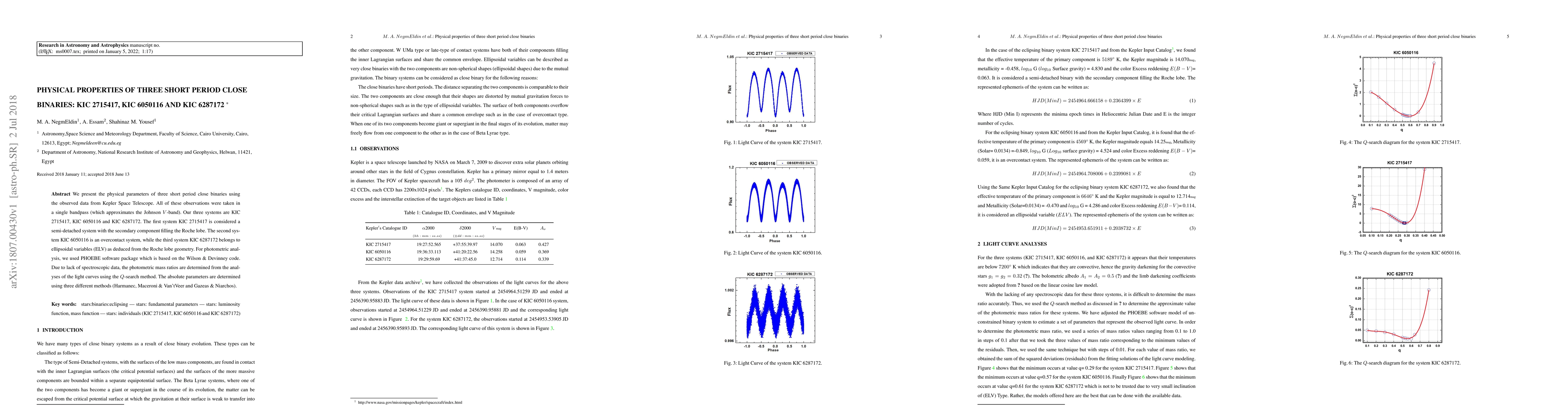This paper presents the physical parameters of three short period close binaries—KIC 2715417, KIC 6050116, and KIC 6287172—observed from the Kepler Space Telescope. The study uses PHOEBE software for photometric analysis and derives mass ratios from light curve data due to the absence of spectroscopic data.