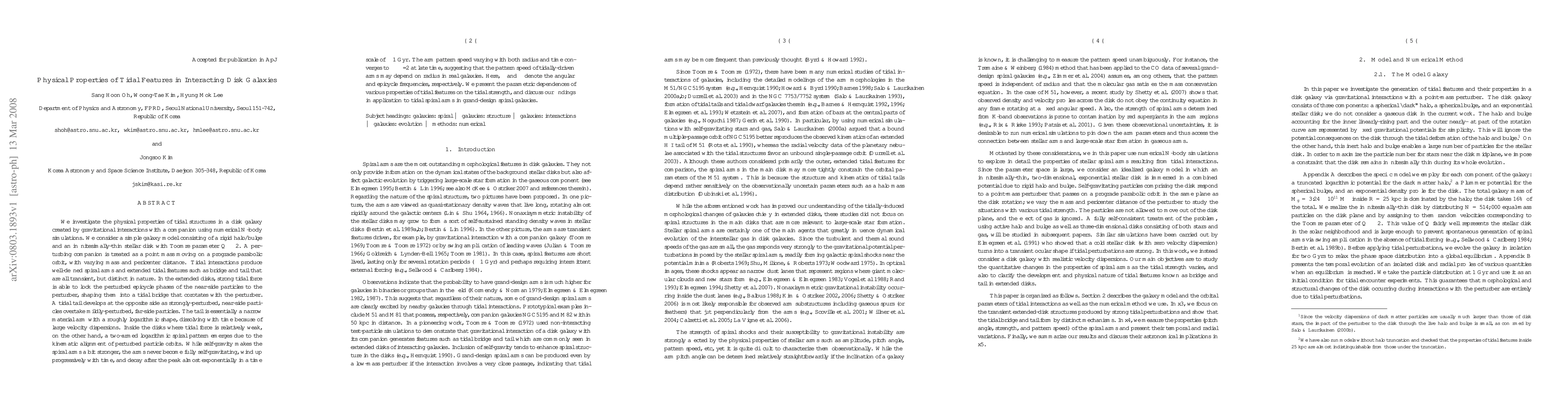 We explore tidal interactions of a galactic disk with Toomre parameter Q ~ 2 embedded in rigid halo/bulge with a point mass companion moving in a prescribed parabolic orbit. Tidal interactions produce well-defined spiral arms and extended tidal features such as bridge and tail that are all transient, but distinct in nature. In the extended disks, strong tidal force is able to lock the perturbed epicycle phases of the near-side particles to the perturber, shaping them into a tidal bridge that corotates with the perturber. A tidal tail develops at the opposite side as strongly-perturbed, near-side particles overtake mildly-perturbed, far-side particles. The tail is essentially a narrow material arm with a roughly logarithmic shape, dissolving with time because of large velocity dispersions. Inside the disks where tidal force is relatively weak, on the other hand, a two-armed logarithmic spiral pattern emerges due to the kinematic alignment of perturbed particle orbits. While self-gravity makes the spiral arms a bit stronger, the arms never become fully self-gravitating, wind up progressively with time, and decay after the peak almost exponentially in a time scale of ~ 1 Gyr. The arm pattern speed varying with both radius and time converges to Omega-kappa/2 at late time, suggesting that the pattern speed of tidally-driven arms may depend on radius in real galaxies. We present the parametric dependences of various properties of tidal features on the tidal strength, and discuss our findings in application to tidal spiral arms in grand-design spiral galaxies. (Abridged)
