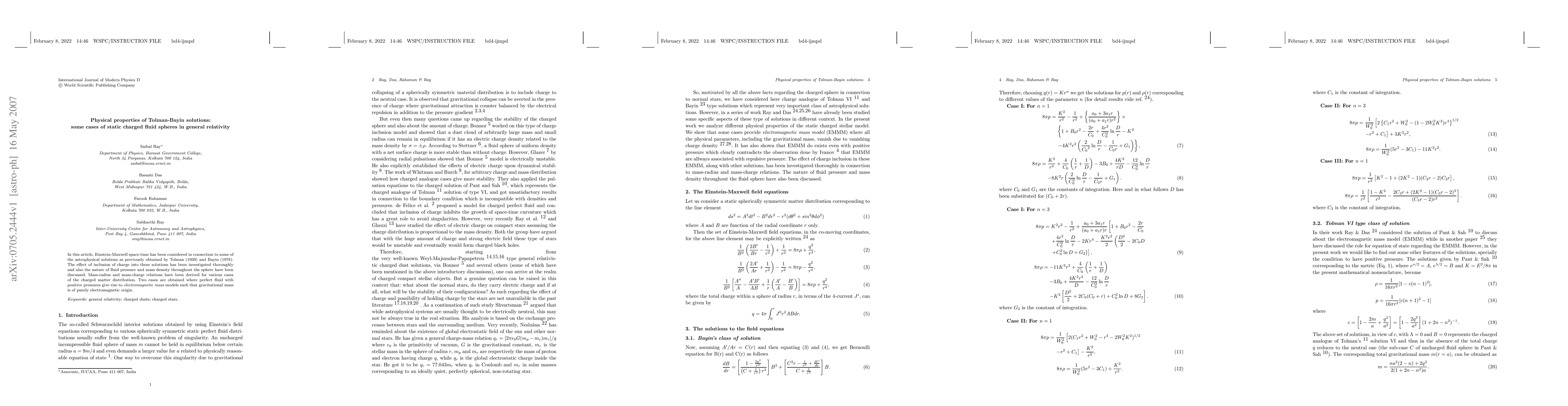 In this article, Einstein-Maxwell space-time has been considered in connection to some of the astrophysical solutions as previously obtained by Tolman (1939) and Bayin (1978). The effect of inclusion of charge into these solutions has been investigated thoroughly and also the nature of fluid pressure and mass density throughout the sphere have been discussed. Mass-radius and mass-charge relations have been derived for various cases of the charged matter distribution. Two cases are obtained where perfect fluid with positive pressures give rise to electromagnetic mass models such that gravitational mass is of purely electromagnetic origin.