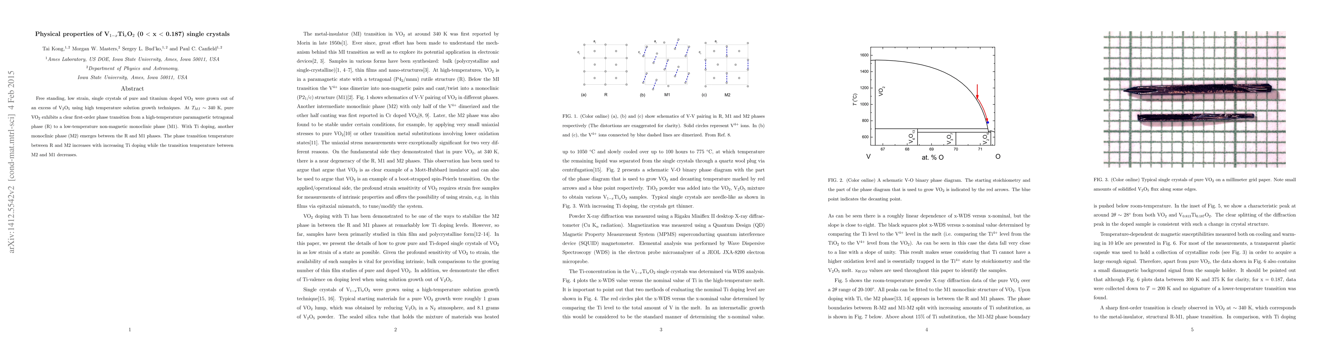 Free standing, low strain, single crystals of pure and titanium doped VO$_{2}$ were grown out of an excess of V$_{2}$O$_{5}$ using high temperature solution growth techniques. At $T_{MI} \sim$ 340 K, pure VO$_{2}$ exhibits a clear first-order phase transition from a high-temperature paramagnetic tetragonal phase (R) to a low-temperature non-magnetic monoclinic phase (M1). With Ti doping, another monoclinic phase (M2) emerges between the R and M1 phases. The phase transition temperature between R and M2 increases with increasing Ti doping while the transition temperature between M2 and M1 decreases.