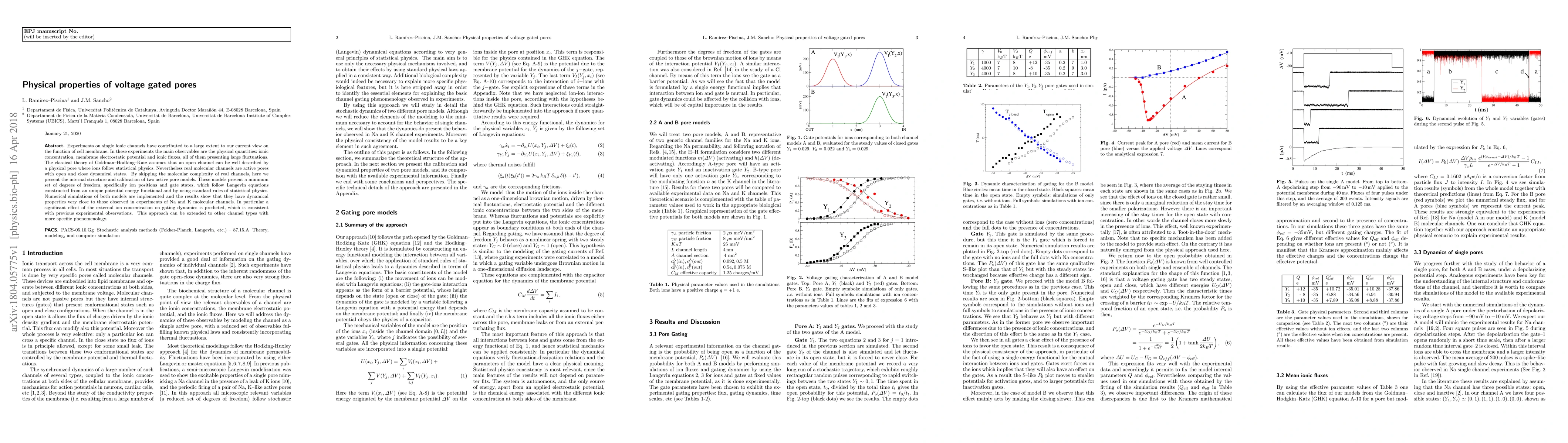 Experiments on single ionic channels have contributed to a large extent to our current view on the function of cell membrane. In these experiments the main observables are the physical quantities: ionic concentration, membrane electrostatic potential and ionic fluxes, all of them presenting large fluctuations. The classical theory of Goldman--Hodking--Katz assumes that an open channel can be well described by a physical pore where ions follow statistical physics. Nevertheless real molecular channels are active pores with open and close dynamical states. By skipping the molecular complexity of real channels, here we present the internal structure and calibration of two active pore models. These models present a minimum set of degrees of freedom, specifically ion positions and gate states, which follow Langevin equations constructed from an unique potential energy functional and by using standard rules of statistical physics. Numerical simulations of both models are implemented and the results show that they have dynamical properties very close to those observed in experiments of Na and K molecular channels. In particular a significant effect of the external ion concentration on gating dynamics is predicted, which is consistent with previous experimental observations. This approach can be extended to other channel types with more specific phenomenology.