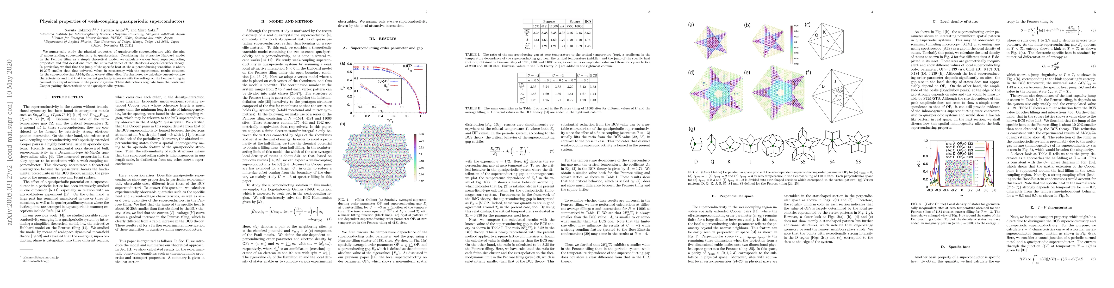This research paper studies quasiperiodic superconductors, finding smaller specific heat jumps at superconducting transitions and gradual current increases with voltage, highlighting nontrivial Cooper pairing characteristics.