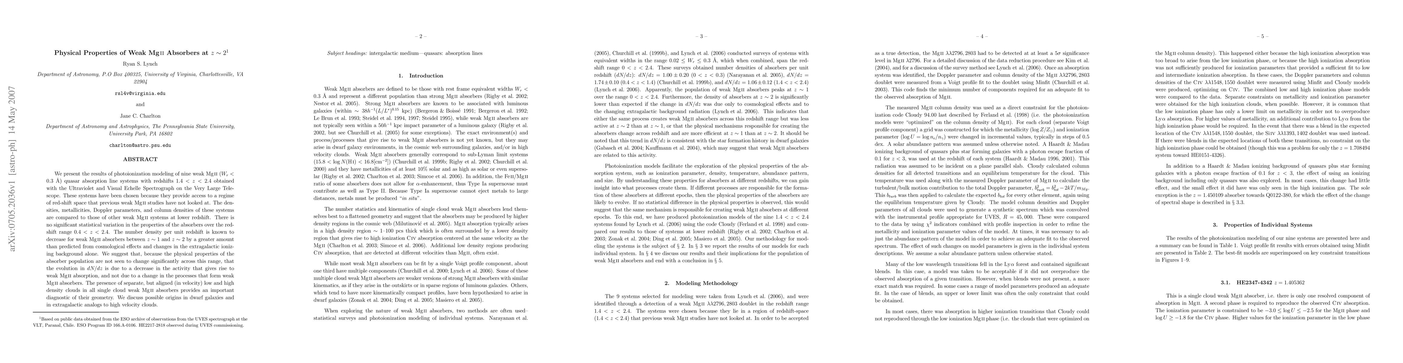 This study examines the physical properties of nine weak MgII absorption systems at redshifts 1.4<z<2.4, finding no significant statistical variation in densities, metallicities, Doppler parameters, and column densities compared to lower redshifts. It concludes that the decrease in absorber number density is due to reduced activity rather than changes in formation processes.