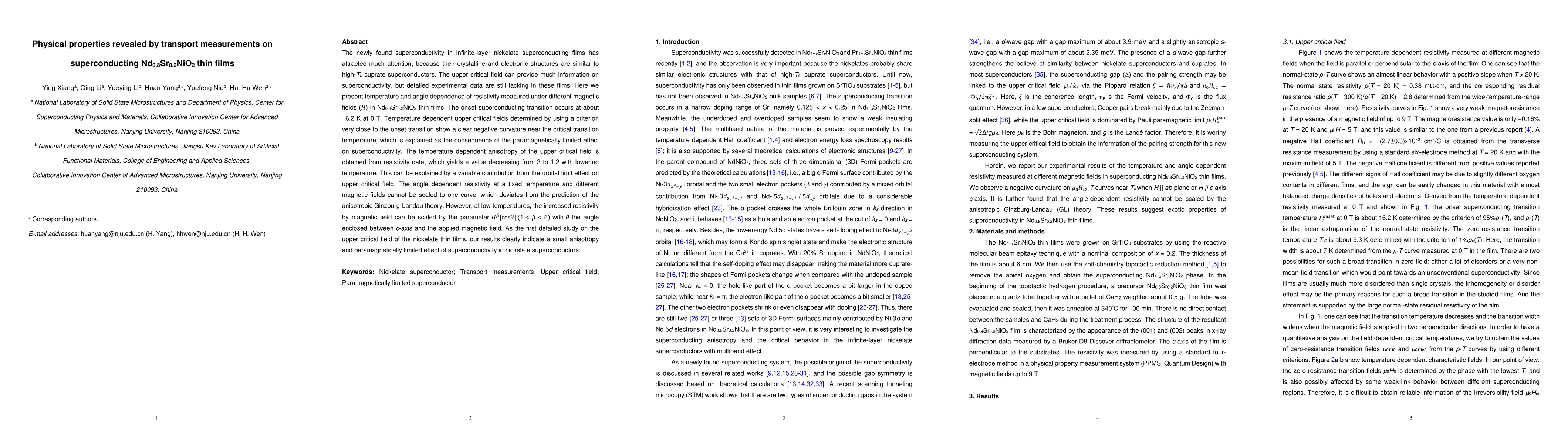 This paper investigates the superconducting properties of Nd$_{0.8}$Sr$_{0.2}$NiO$_{2}$ thin films through resistivity measurements under varying magnetic fields. The findings reveal a small anisotropy and paramagnetically limited superconductivity, with the upper critical field showing a negative curvature near the transition temperature.