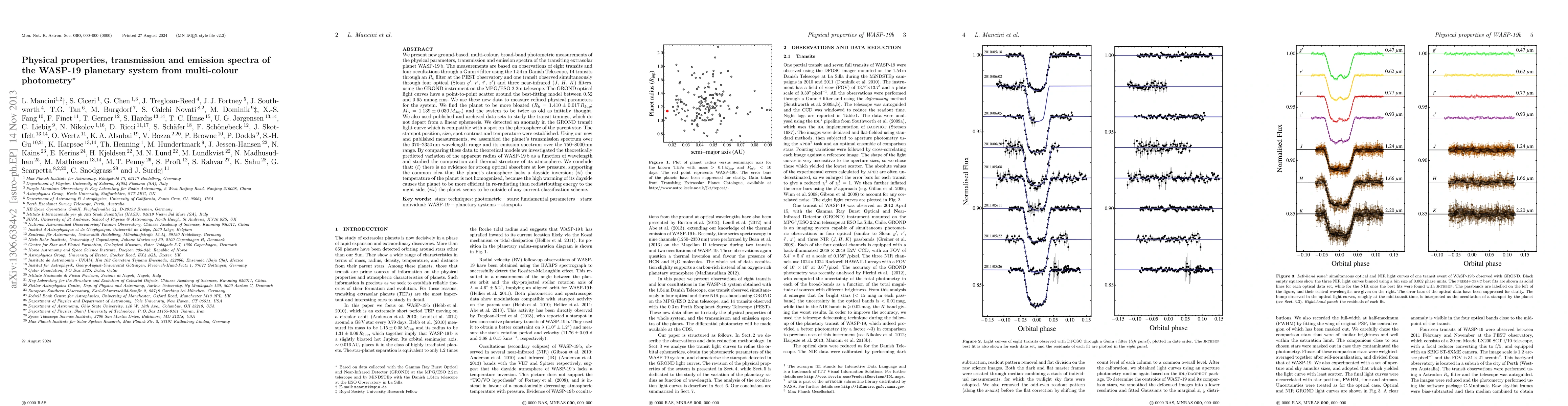 This paper reports refined physical parameters of the WASP-19b exoplanet, including its bloated nature and an older system age, based on multi-colour photometric observations. It also detects a star spot on the parent star and provides detailed transmission and emission spectra, concluding that the planet's atmosphere lacks strong optical absorbers and its temperature is not homogenized due to high dayside warming.