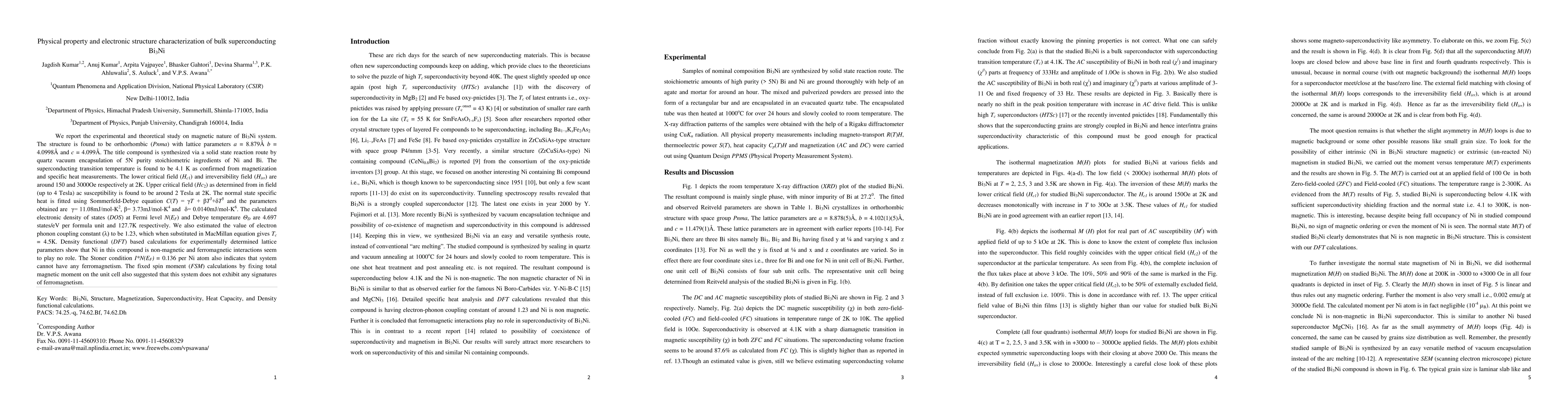We report the experimental and theoretical study on magnetic nature of Bi3Ni system. The structure is found to be orthorhombic (Pnma) with lattice parameters a = 8.879{\AA} b = 4.0998{\AA} and c = 4.099{\AA}. The title compound is synthesized via a solid state reaction route by quartz vacuum encapsulation of 5N purity stoichiometric ingredients of Ni and Bi. The superconducting transition temperature is found to be 4.1 K as confirmed from magnetization and specific heat measurements. The lower critical field (Hc1) and irreversibility field (Hirr) are around 150 and 3000Oe respectively at 2K. Upper critical field (Hc2) as determined from in field (up to 4 Tesla) ac susceptibility is found to be around 2 Tesla at 2K. The normal state specific heat is fitted using Sommerfeld-Debye equation C(T) = {\gamma}T + {\beta}T3+{\delta}T5 and the parameters obtained are {\gamma}= 11.08mJ/mol-K2, {\beta}= 3.73mJ/mol-K4 and {\delta}= 0.0140mJ/mol-K6. The calculated electronic density of states (DOS) at Fermi level N(EF) and Debye temperature {\Theta}D are 4.697 states/eV per formula unit and 127.7K respectively. We also estimated the value of electron phonon coupling constant ({\lambda}) to be 1.23, which when substituted in MacMillan equation gives Tc = 4.5K. Density functional (DFT) based calculations for experimentally determined lattice parameters show that Ni in this compound is non-magnetic and ferromagnetic interactions seem to play no role. The Stoner condition I*N(EF) = 0.136 per Ni atom also indicates that system cannot have any ferromagnetism. The fixed spin moment (FSM) calculations by fixing total magnetic moment on the unit cell also suggested that this system does not exhibit any signatures of ferromagnetism.