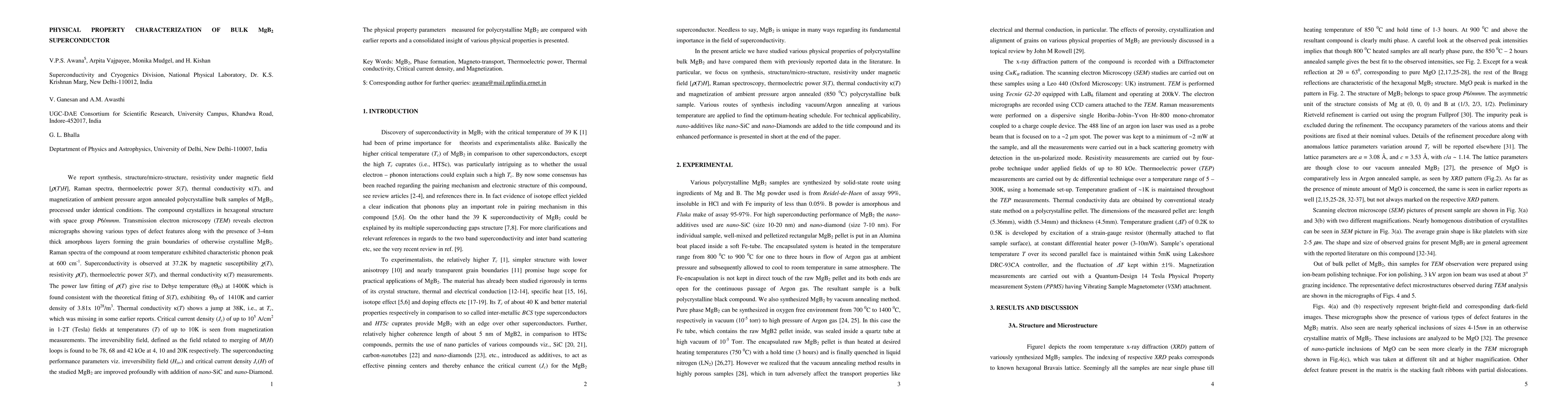 The paper details the synthesis and characterization of bulk MgB2 superconductor, revealing its hexagonal structure and defect features via TEM. Superconductivity at 37.2K is confirmed through multiple measurements. A jump in thermal conductivity at Tc is noted, along with high critical current density and improved superconducting parameters with nano-SiC and nano-Diamond additions. The findings offer a comprehensive understanding of MgB2's physical properties.