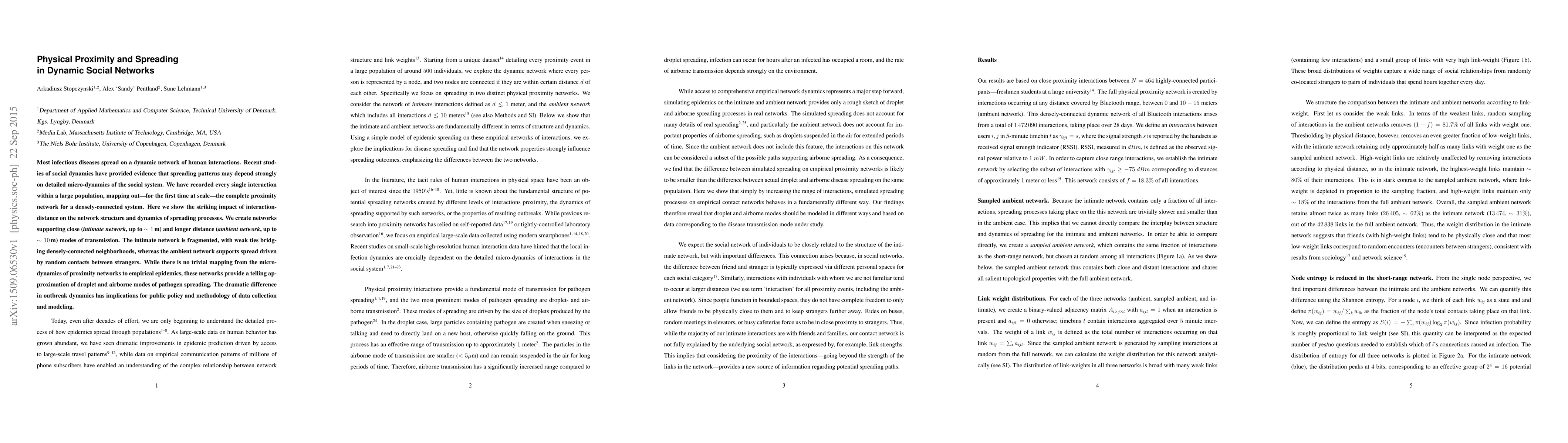 Most infectious diseases spread on a dynamic network of human interactions. Recent studies of social dynamics have provided evidence that spreading patterns may depend strongly on detailed micro-dynamics of the social system. We have recorded every single interaction within a large population, mapping out---for the first time at scale---the complete proximity network for a densely-connected system. Here we show the striking impact of interaction-distance on the network structure and dynamics of spreading processes. We create networks supporting close (intimate network, up to ~1m) and longer distance (ambient network, up to ~10m) modes of transmission. The intimate network is fragmented, with weak ties bridging densely-connected neighborhoods, whereas the ambient network supports spread driven by random contacts between strangers. While there is no trivial mapping from the micro-dynamics of proximity networks to empirical epidemics, these networks provide a telling approximation of droplet and airborne modes of pathogen spreading. The dramatic difference in outbreak dynamics has implications for public policy and methodology of data collection and modeling.