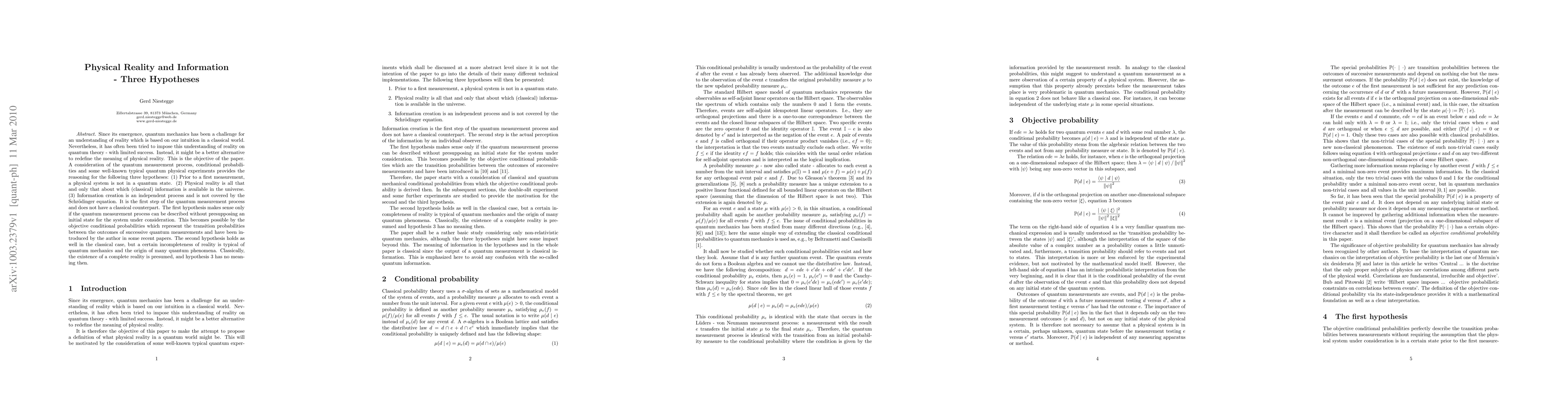 This paper proposes three hypotheses to redefine the concept of physical reality in light of quantum mechanics: (1) Physical systems are not in a quantum state before measurement, (2) Physical reality is defined by available classical information, and (3) Information creation is a separate process not covered by the Schrödinger equation, initiating the quantum measurement process.