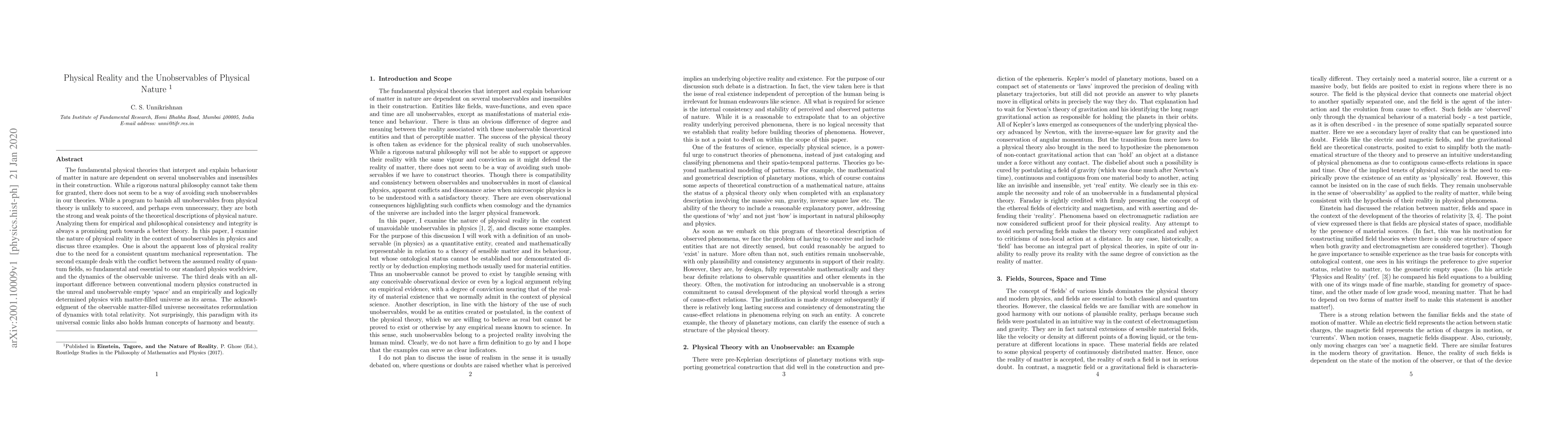 The fundamental physical theories that interpret and explain behaviour of matter in nature are dependent on several unobservables and insensibles in their construction. While a rigorous natural philosophy cannot take them for granted, there does not seem to be a way of avoiding such unobservables in our theories. While a program to banish all unobservables from physical theory is unlikely to succeed, and perhaps even unnecessary, they are both the strong and weak points of the theoretical descriptions of physical nature. Analyzing them for empirical and philosophical consistency and integrity is always a promising path towards a better theory. In this paper, I examine the nature of physical reality in the context of unobservables in physics and discuss three examples. One is about the apparent loss of physical reality due to the need for a consistent quantum mechanical representation. The second example deals with the conflict between the assumed reality of quantum fields, so fundamental and essential to our standard physics worldview, and the dynamics of the observable universe. The third deals with an all-important difference between conventional modern physics constructed in the unreal and unobservable empty `space' and an empirically and logically determined physics with matter-filled universe as its arena. The acknowledgment of the observable matter-filled universe necessitates reformulation of dynamics with total relativity. Not surprisingly, this paradigm with its universal cosmic links also holds human concepts of harmony and beauty.