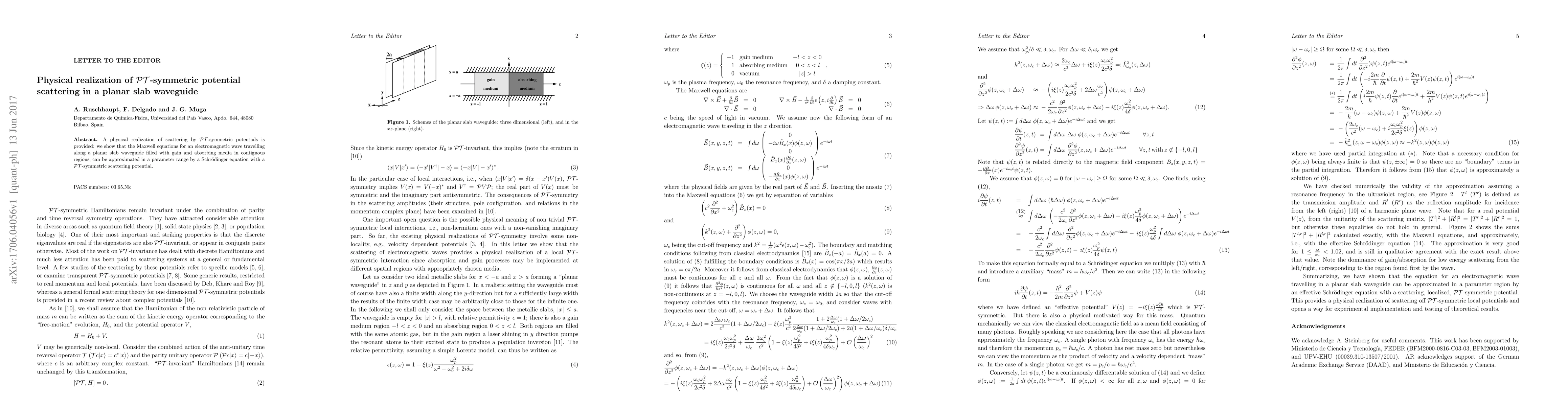 This paper presents a physical realization of scattering by ${\cal{PT}}$-symmetric potentials in a planar slab waveguide, demonstrating that the Maxwell equations for electromagnetic waves can be approximated by a Schrödinger equation with a ${\cal{PT}}$-symmetric scattering potential.