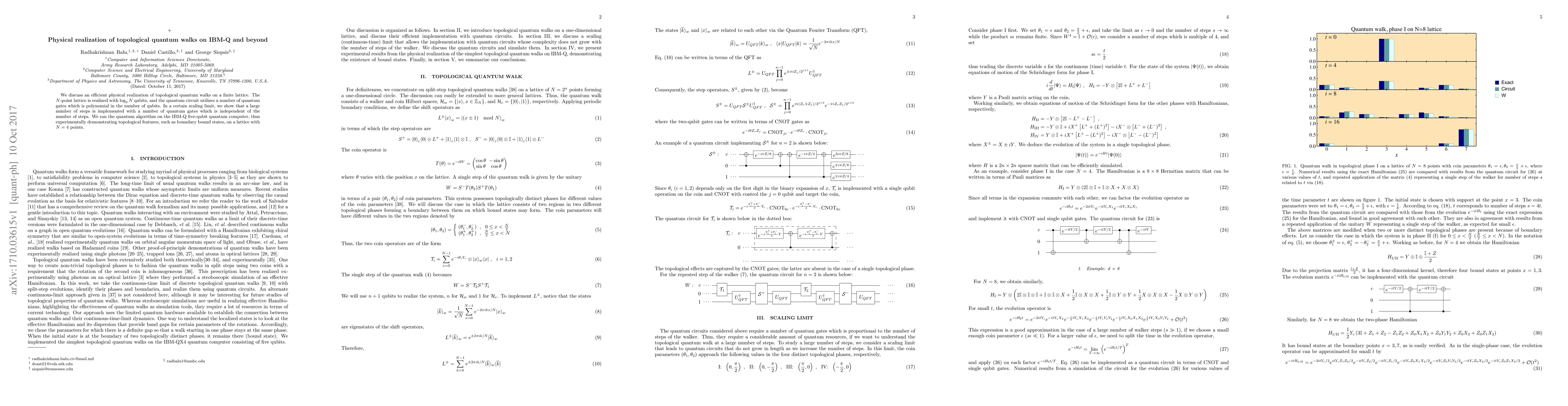 This paper presents an efficient physical realization of topological quantum walks on a finite lattice using IBM-Q's five-qubit quantum computer, demonstrating boundary bound states and showing that a large number of steps can be implemented with a minimal number of quantum gates. The proposed quantum circuit scales polynomially with the number of qubits.