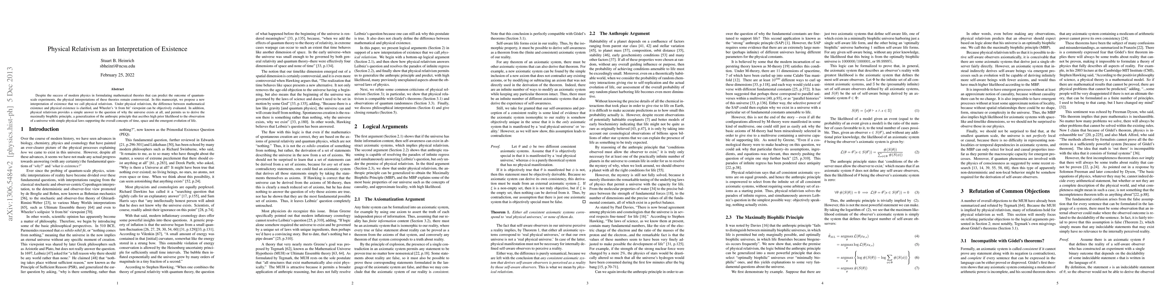 Despite the success of modern physics in formulating mathematical theories that can predict the outcome of quantum-scale experiments, the physical interpretations of these theories remain controversial. In this manuscript, we propose a new interpretation of existence that we call physical relativism. Under physical relativism, the difference between mathematical existence and physical existence is clarified, and Wheeler's `it from bit' viewpoint can be objectively evaluated. In addition, physical relativism provides a simple answer to the question of why the universe exists at all, and permits us to derive the maximally biophilic principle, a generalization of the anthropic principle that ascribes high prior likelihood to the observation of a universe with simple physical laws supporting the overall concepts of time, space and the emergent evolution of life.