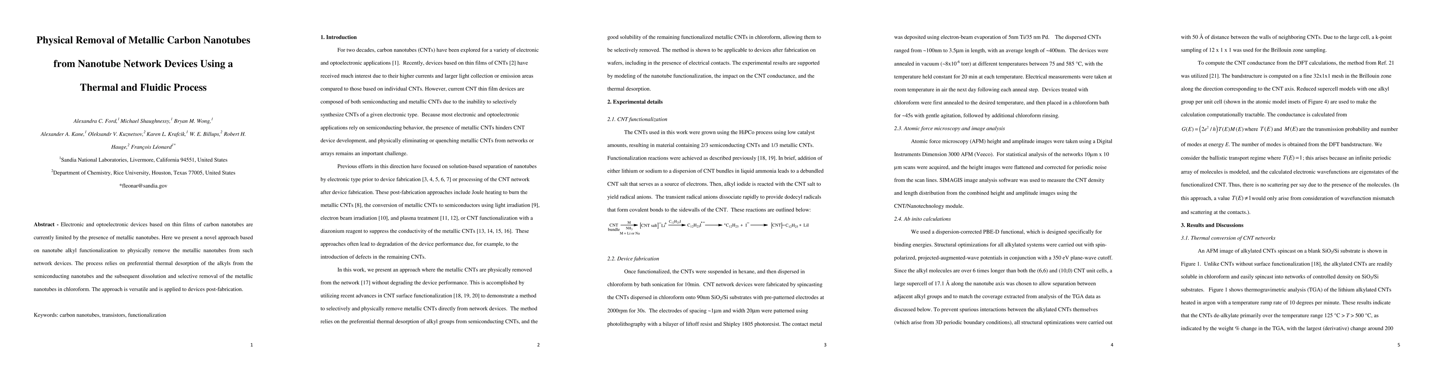 This research introduces a method to selectively remove metallic carbon nanotubes from nanotube network devices via alkyl functionalization, thermal desorption, and dissolution in chloroform, enabling improved performance of electronic and optoelectronic devices. The technique is adaptable for use after device fabrication.